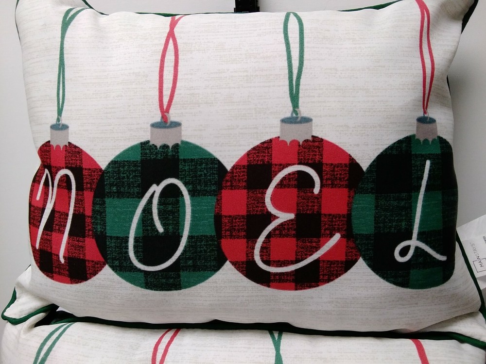 New Mainstays Christmas Outdoor Lumbar Pillows Set of 2 Ivory 16X12 "NOEL" Balls * Ivory with Red & Green Balls Spelling "NOEL" * Back Side Green & Black Plaid * Zip Closure * 100% Polyester * Surface Wash * Fade Resistant Fabric