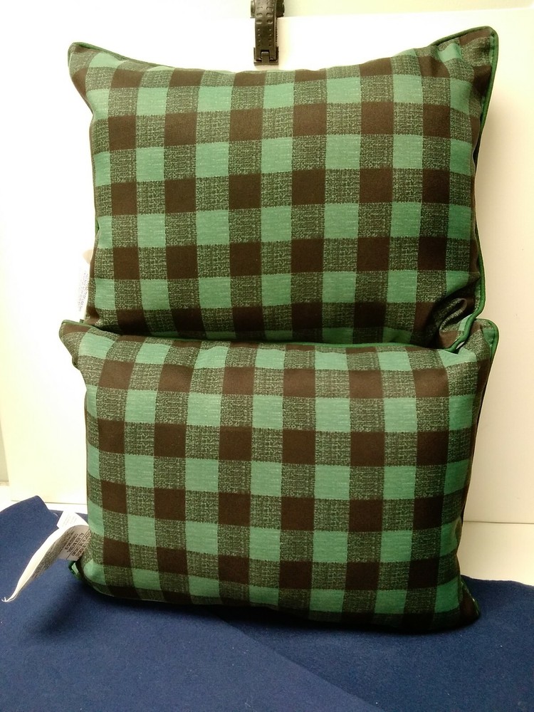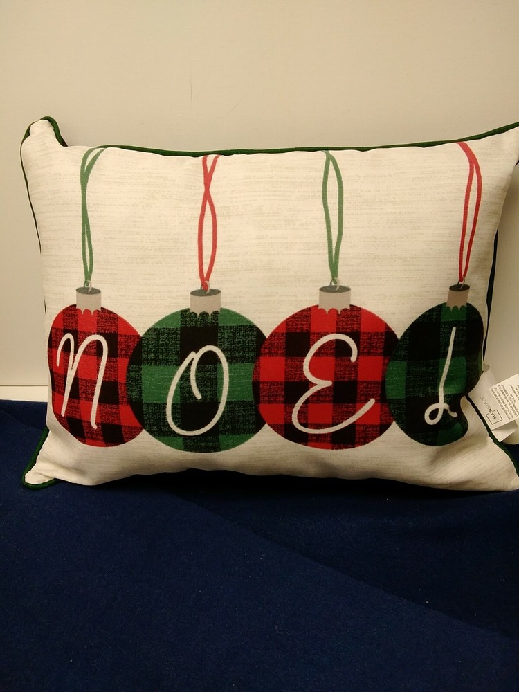 New Mainstays Christmas Outdoor Lumbar Pillows Set of 2 Ivory 16X12 "NOEL" Balls * Ivory with Red & Green Balls Spelling "NOEL" * Back Side Green & Black Plaid * Zip Closure * 100% Polyester * Surface...