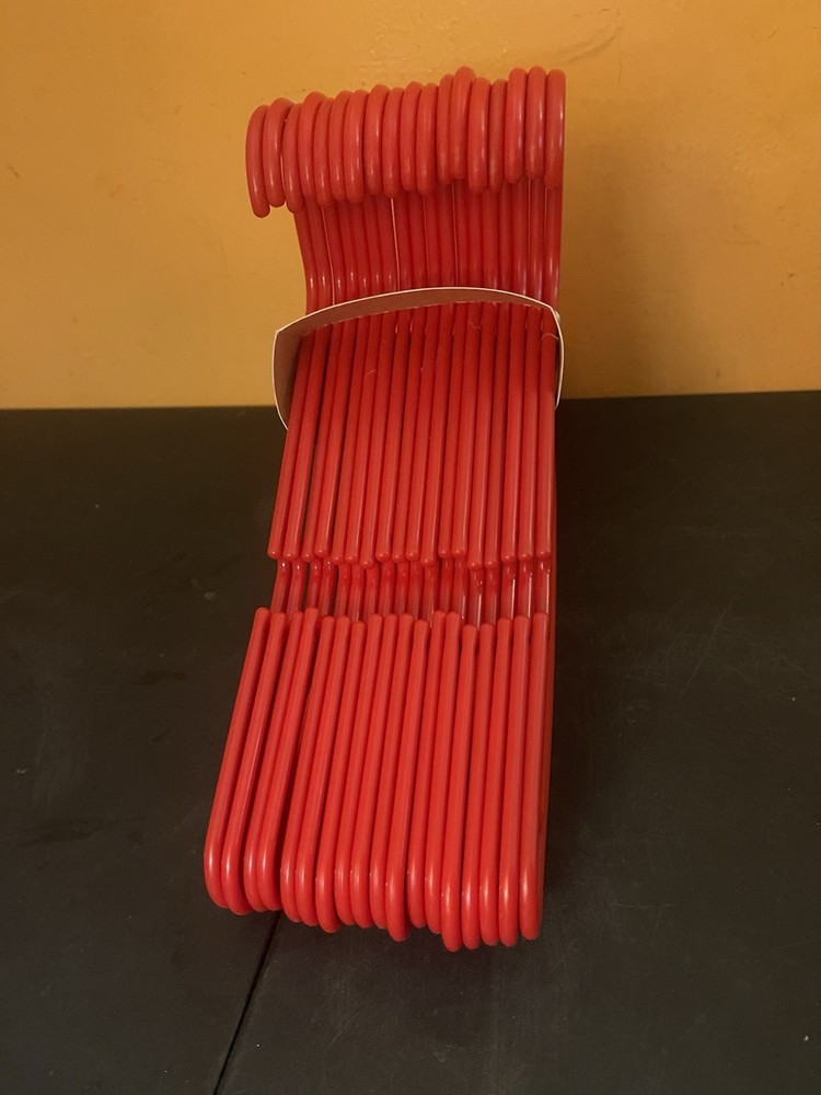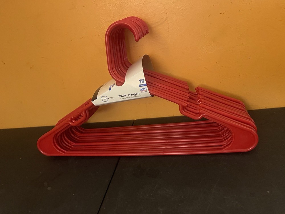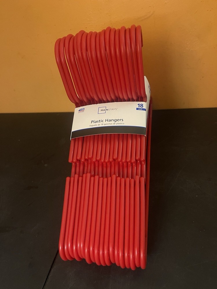 The Mainstays Clothing Hangers are a durable 18-pack of red plastic hangers, perfect for organizing your closet. These traditional hangers are solid in color with a smooth finish and feature notches for securely hanging coats, jackets, shirts, and skirts. Made in the United States, these hangers are 9 inches long and 4.81 inches wide, providing a sturdy and reliable option for keeping your clothes neatly organized.