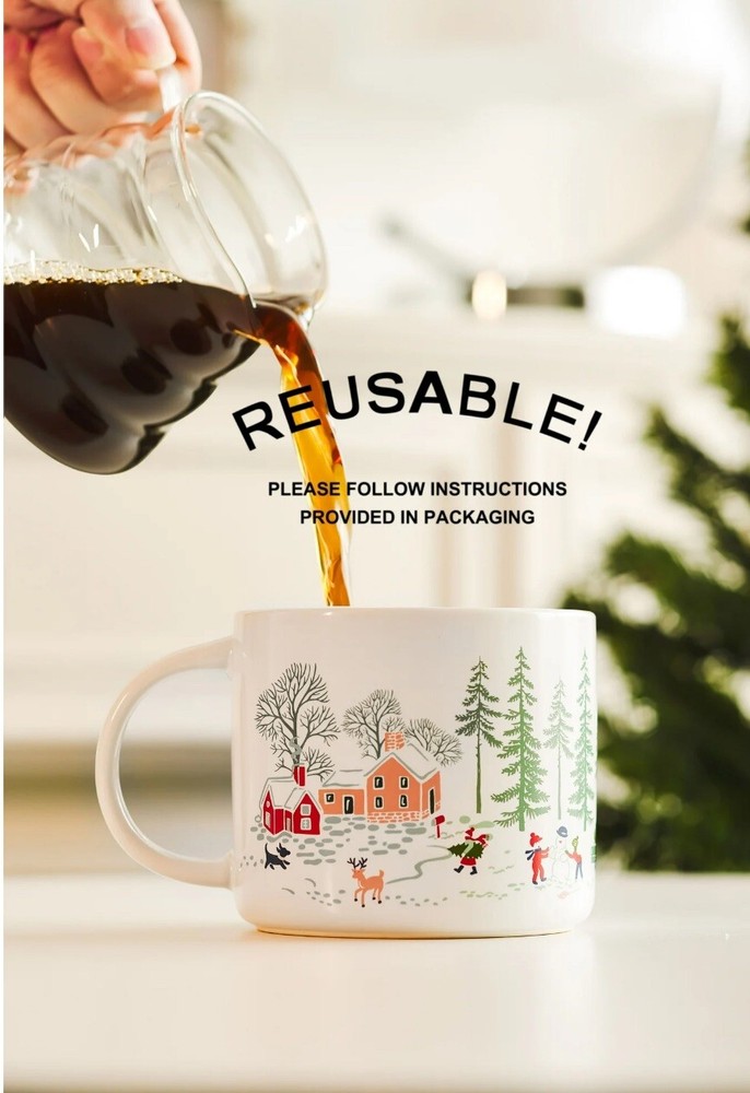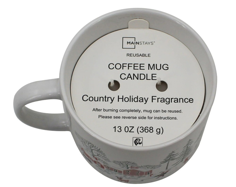 Make your home feel even more welcoming with the harmonious fragrances of the Mainstays 2-Wick 13-ounce Reusable Village Holiday Coffee Mug Scented Candle, Country Holiday, White- and when the wax is gone, use the mug to enjoy a comforting beverage. This aromatic jar candle features clean-burning paraffin wax, 2 cotton wicks and winterberry, snowdrop petals, and cypress fragrance notes. It’s nestled into a charming, white, ceramic coffee mug with multicolored red, green, and brown graphics of a country village winter holiday scene. The candle is for indoor use only and burns for 30–40 hours. After the candle burns completely away, the reusable, dishwasher-safe mug can be washed thoroughly and used for drinking hot coffee, cocoa, tea, cider, and more. With its 13-ounce capacity and easy-to-grip handle, you can savor countless sips and special moments throughout the holiday season and all year long. And speaking of holidays, the coffee-mug, scented candle makes a wonderful 2-in-1 gift. With the Mainstays 2-Wick 13-ounce Reusable Village Holiday Coffee Mug Scented Candle, repurposing is easy, enjoyable, and rewarding. Mainstays 2-Wick 13-ounce Reusable Village Holiday Coffee Mug Scented Candle, Country Holiday, White Reusable, coffee-mug, scented candle adds welcoming feel with aromatic fragrances Jar candle features clean-burning paraffin wax, 2 cotton wicks and winterberry, snowdrop petals, and cypress fragrance notes White, ceramic coffee mug features easy-to-grip handle and red, green, and brown graphics of a country village winter holiday scene Candle is for indoor use only and burns for 30–40 hours Mug is ideal for drinking hot coffee, cocoa, tea, cider, and more Makes a great 2-in-1 gift and inspires special moments Dimensions: 4.1"D x 3.54"H x 5.5"W Capacity: 13 oz Instructions and care: For indoor use only, reusable as a coffee mug after burning candle completely and cleaning mug thoroughly, food safe and dishwasher safe (Please see complete instructions on dust cover and UPC sticker)
