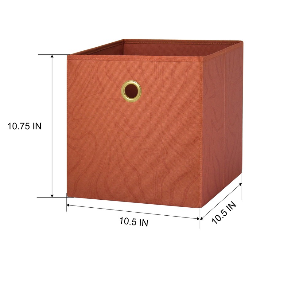 Product details Our Mainstays Red Canyon Swirl Collapsible Fabric Storage Bins are just what you need to help you create an organized home. Perfect for storing kids to adult clothes, books, electronics and more, these bins' 10.5-inch by 10.5-inch by 11-inch size offers plenty of room to keep a wide variety of belongings neatly tucked away, and their sturdy, round metal handle allow you to pull them off shelves and slide them back in with ease. You can utilize our Mainstays Storage Cube's organizational expertise in your living room, bedroom, laundry room, and dorm room. When not in use, you can easily fold the bin down flat and keep it stored away in your closet for later. The fabric storage cubes are made to fit with our Mainstays Cube Storage Organizers (not included) and are designed with a durable polyester fabric that holds their shape. With a variety of colors to choose from, you'll be able to perfectly match your home decor when you get organized with our Mainstays Collapsible Fabric Storage Bins. Helps you to create an organized and comfortable home Includes 4 red canyon printed cube organizer bins Perfect for pairing with your favorite colors and patterns to mix and match Bin features an easy carry handle on the side that makes it easy to take the bin wherever you need to go Can be used with our Mainstays Cube Storage Organizer units or independently Cubes are collapsible when not in use to maximize your space Ideal for storing books or kids and adult clothing in the bedroom, living room, laundry room or dorm rooms Made of durable polyester fabric that won't crease easily, has good abrasion resistance and holds its shape Dimensions: 10.5" L x 10.5" W x 10.75" H (26.5 cm x 26.5 cm x 27.3 cm)