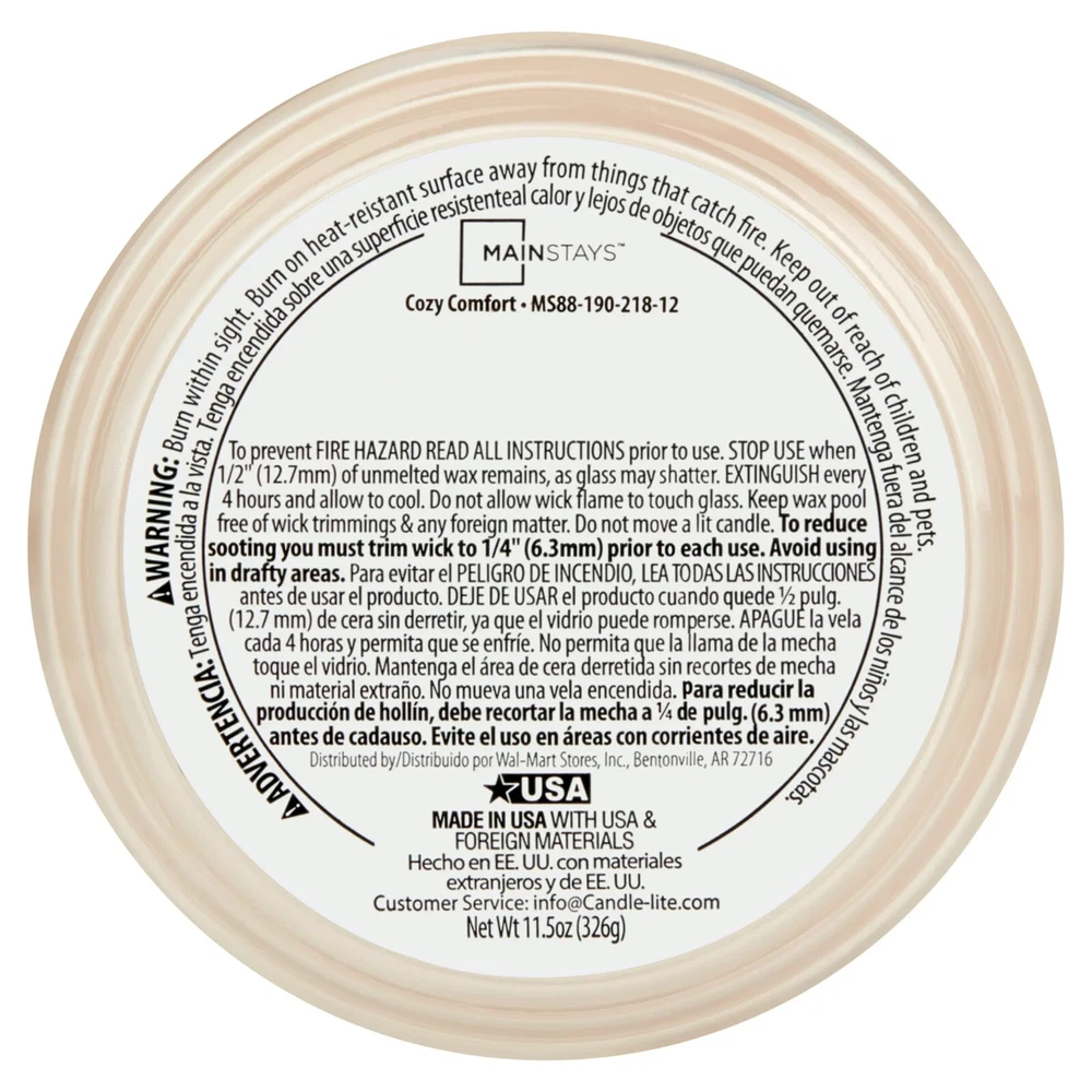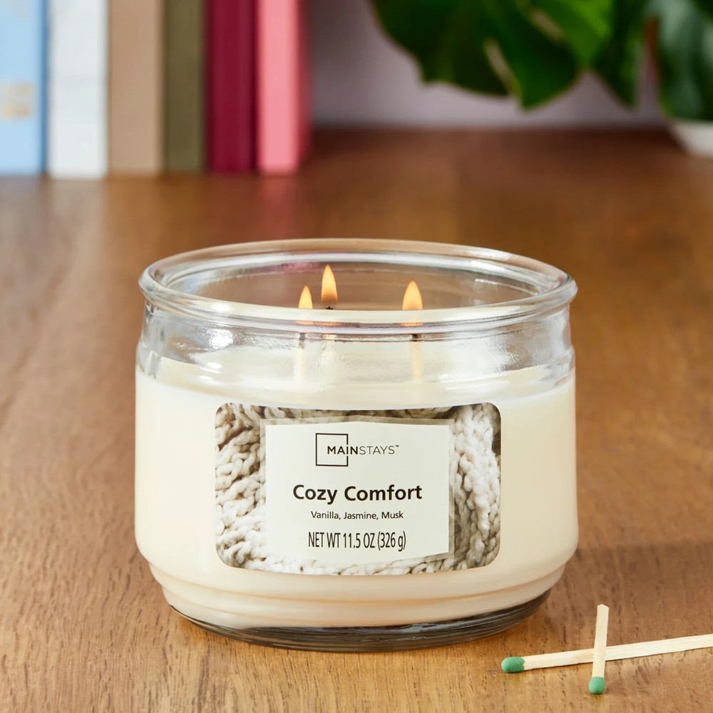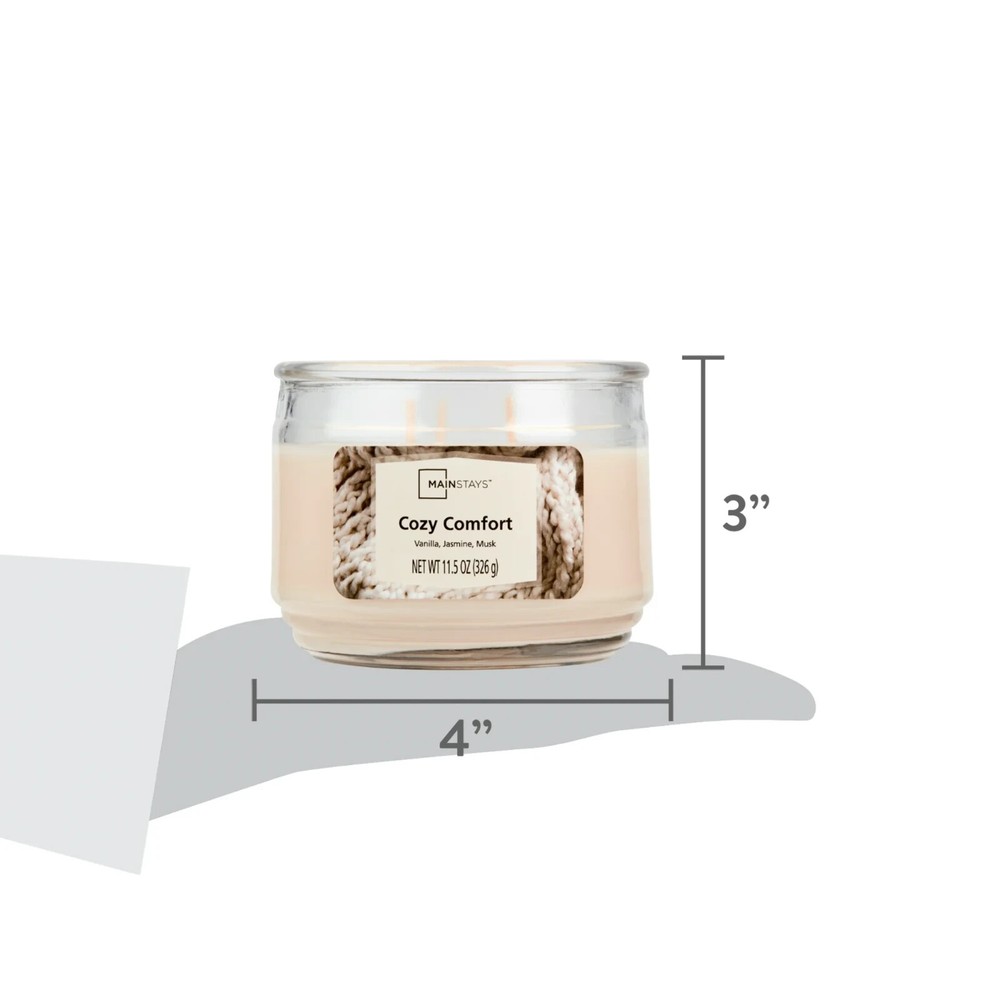 Mainstays Cozy Comfort Scented 3-Wick Glass Jar Candle, 11.5 oz Mainstays Cozy Comfort fragrance, contains a comforting blend of vanilla buttercream, jasmine petals and warm musk sprinkled with brown sugar and vibrant red berries Adds coziness and warmth to your home Provides just the right amount of illumination with a 3-wick design Clear glass container complements virtually any room decor Pleasant scent for a relaxing environment without becoming overpowering Helps improve concentration, mood, and positive thinking Product measures 4.12" D x 3.2" H Product weighs 1.37 lbs Mainstays Cozy Comfort Scented 3-Wick Glass Jar Candle, 11.5 oz Mainstays Cozy Comfort fragrance, contains a comforting blend of vanilla buttercream, jasmine petals and warm musk sprinkled with brown sugar and vibrant red berries Premium-grade paraffin wax blended with premium quality ingredients to create distinctive true-to-life scents Clear glass container complements virtually any room décor and provides just the right amount of illumination with a 3-wick design Pleasant scent for a relaxing environment without becoming overpowering. Helps improve concentration, mood, and positive thinking Product measures 4.12" D x 3.2" H Product weighs 1.37 lbs