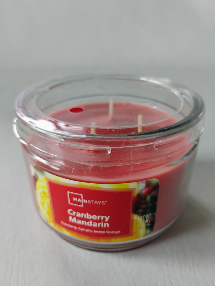 Mainstays Cranberry Mandarin Scented 3-Wick Glass Jar Candle, 11.5 oz. Mainstay Cranberry Mandarin fragrance, contains sun-ripened cranberries embellished with tangy hints of fresh currant, juicy raspberry, and sparkling mandarin. This fragrance has been a staple in households and a favorite for many years. This fragrance would fall in the FRUIT category. Premium-grade paraffin wax blended with premium quality ingredients to create distinctive true-to-life scents Clear glass container complements virtually any room décor and provides just the right amount of illumination with a 3-wick design Pleasant scent for a relaxing environment without becoming overpowering. Helps improve concentration, mood, and positive thinking Product measures 4.12" D x 3.2" H Product weighs 1.37 lbs