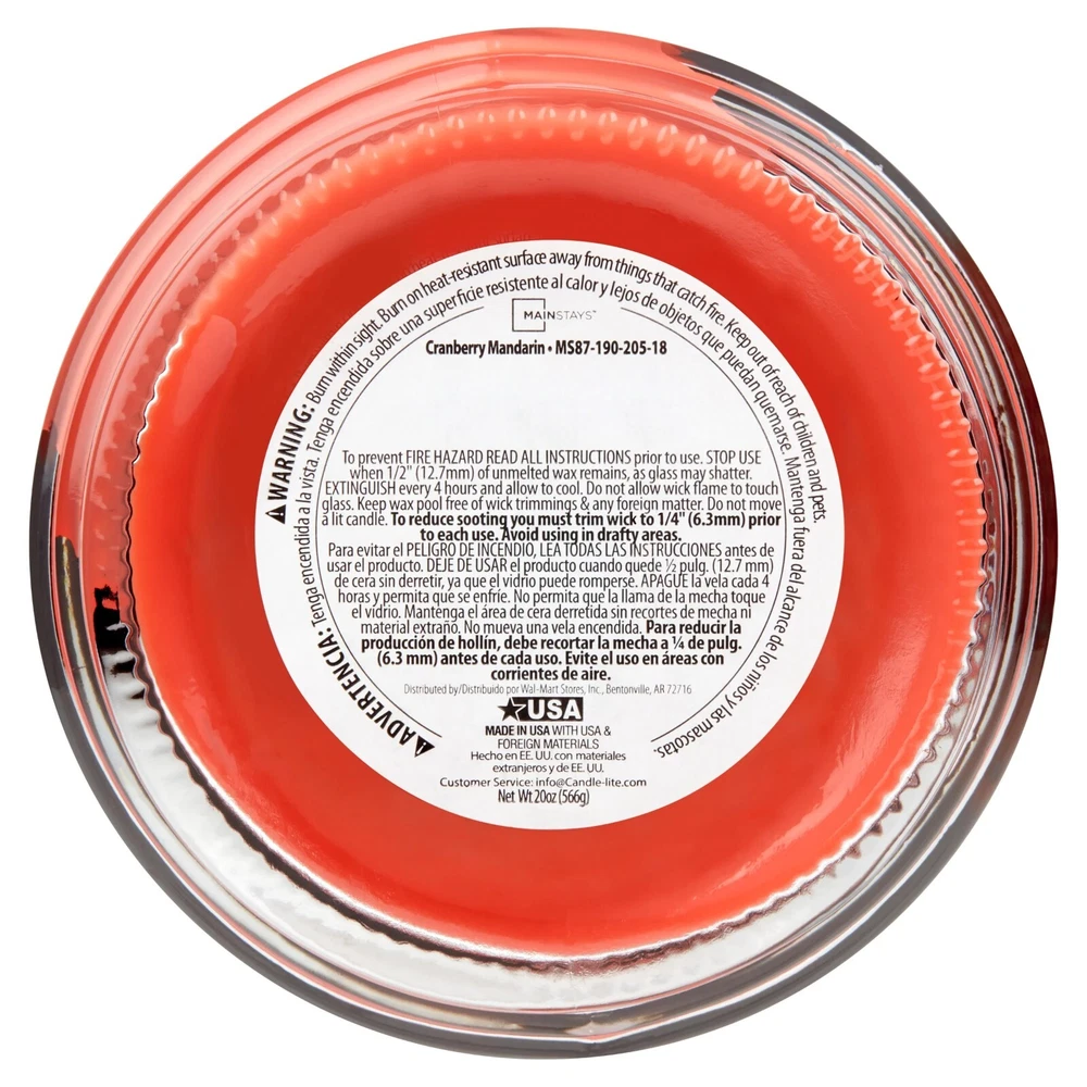Mainstays Cranberry Mandarin Scented Single-Wick Large Glass Jar Candle, 20 oz About this item Product details Introduce a soothing aroma into your living space with the Mainstays Cranberry Scented Mandarin Single-Wick Large Glass Jar Candle. Mainstays scented candles are highly fragranced and provide a clean and even burn that will fill your home with beautiful and enticing seasonal aromas. Place this candle in the kitchen, living room or dining room where you can enjoy it when entertaining guests or anytime you want to relax. Trim the wick periodically to promote even burning. Mainstays offers a wide selection of candle scents to explore and enjoy. Shop all of our Mainstays scents online and in-store. Treat yourself to the enticing scent of the Mainstays Cranberry Scented Mandarin Single-Wick Large Glass Jar Candle. Mainstays Cranberry Scented Mandarin Single-Wick Large Glass Jar Candle, 20 oz Mainstay Cranberry Mandarin fragrance, contains sun-ripened cranberries embellished with tangy hints of fresh currant, juicy raspberry, and sparkling mandarin. This fragrance has been a staple in households and a favorite for many years. This fragrance would fall in the FRUIT category. Complements virtually any room decor 20 oz. single-wick candle burns for approximately 100-120 hours Features a decorative beveled edge glass vessel Mainstays single-wick scented candles are highly fragranced, and provide a clean and even burn that will fill your home with beautiful and enticing aromas Our candles are made from high quality, non-toxic, clean-burning wax that is specifically developed to hold optimal fragrance loads Our Mainstays 20oz candle is available in a variety of scents Directions Instructions Extinguish every 4 hours and allow to cool. Do not allow wick flame to touch glass. Keep wax pool free of wick trimmings & any foreign matter. Do not move a lit candle. To reduce sooting you must trim wick 1/4" prior to each use. Avoid using in drafty areas. Contact us We can be contacted at any time through eBay messages if you have any questions, comments or product requests. We will respond to you within 24 hours and do our best to help you out! We encourage our customers to contact us with any questions or concerns! We'd like to be sure you are completely satisfied with your purchase. Shipping We offer FREE shipping on all orders! We ship within 7 business days of payment, usually sooner. We use a selection of shipping services such as UPS, FedEx, USPS etc. We only ship to the lower 48 states, no APO/FPO addresses or PO Boxes allowed. Local pickups and combined shipping options are not provided at this time. Feedback Customer satisfaction is very important to us. If you have any problem with your order, please contact us and we will do our best to make you satisfied. Thank you for shopping at our store