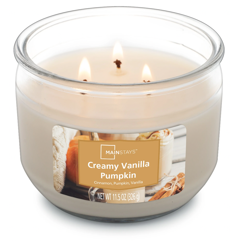 Creamy Vanilla Pumpkin - This scented 3-wick wrapped candle from Mainstays is a highly fragranced candle that is poured with a premium wax blend that allows for a smooth, consistent burn. These Mainstays scented candles are packaged in a decorative glass jar in a variety of fragrances and designs that will go well with all your current home decor. The candles have a lead-free wick and are poured in the USA. 3 wick candle scented with notes of: cinnamon, pumpkin, vanilla and caramel. • Product measures:4.1875” W x 4.1875” D x 3.25” H • Product weighs: 1.4 lbs. • No assembly required.• Perfect for any room in your home or for gift giving. Mainstays Warm Apple Pie Scented 3-Wick Glass Jar Candle, 11.5 oz Product measures:4" W x 4" D x 3.2" H Product weighs: 1.34 lbs No assembly required Perfect for any room in your home or for gift giving Follow these tips for the perfect burn: Always trim wick to ¼ inch before lighting and keep debris out of wax pool Do not burn more than 3 hours at one use, and allow wax to harden before relighting, touching or moving. Set candle on a heat-resistant surface and keep out of drafts. Always burn within sight and extinguish before leaving room. Do not burn near things that can catch fire, and keep away from children and pets. Do not extinguish with water. No assembly required Perfect for any room in your home Recyclable vessel Great for gift giving or keep for yourself