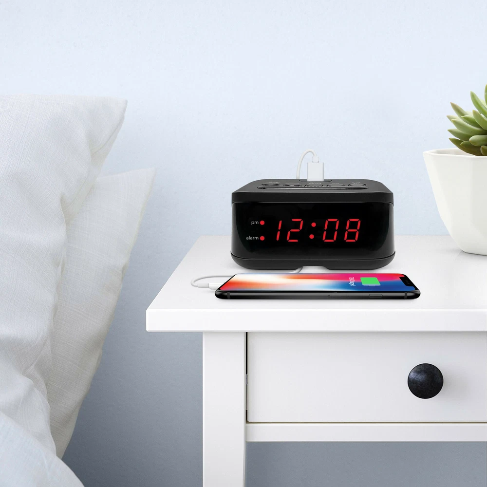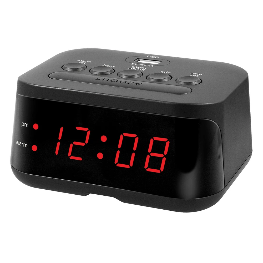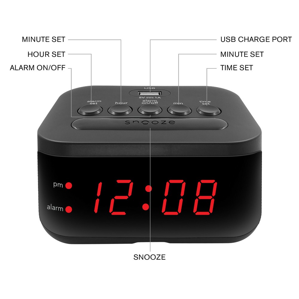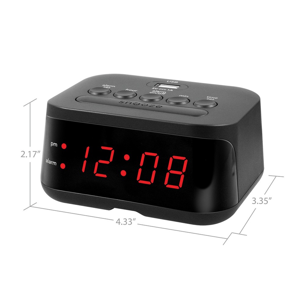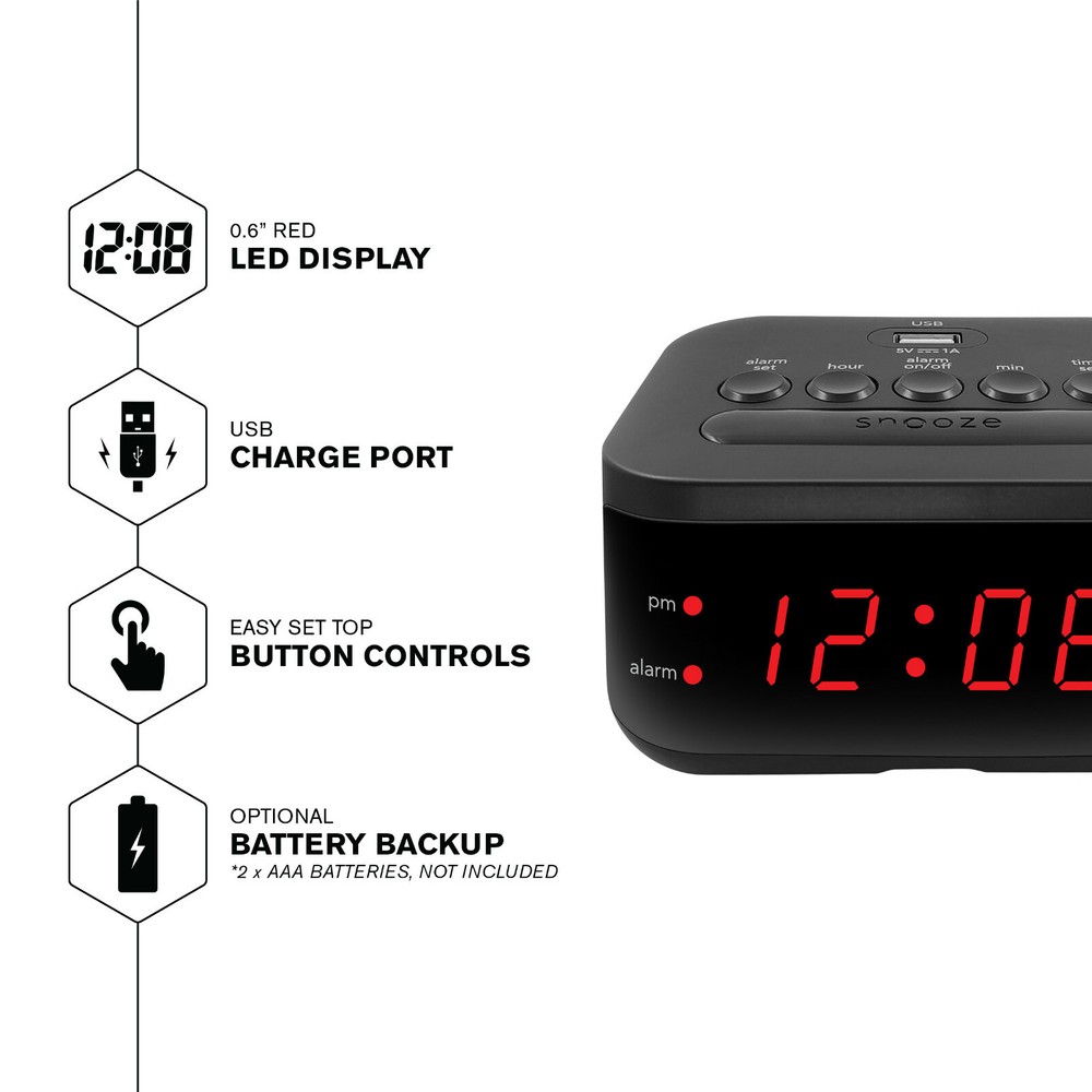 MAIN STAYS DIGITAL ALARM CLOCK WITH USB CHARGING PORT 100% BRAND NEW 0.6" RED LED DISPLAY | USB CHARGE PORT | BATTERY BACKUP Wake up on time with a charged smartphone with the Digital Alarm Clock with USB Charge Port from Mainstays. The versatile alarm clock conveniently has a USB charge port on the top of its case that can be used to charge your smartphone. The small size is a perfect fit for your nightstand. Additional accessories shown are not included. This clock is electric operated; the battery backup does not power the clock. The battery backup is used for storing the time and alarm settings if the power is interrupted. During battery backup the clock’s display will not be lit. Once the power is restored the display will re-light. Check the time to make sure it is accurate and adjust if necessary. • 0.6" Red LED Display • 1 AMP USB Charge Port • Snooze • Battery Back-up – requires 2 x AAA batteries (not included) • Dimensions (4.33" x 3.35" x 2.17") • Voltage: 110-120V AC (US Plug)