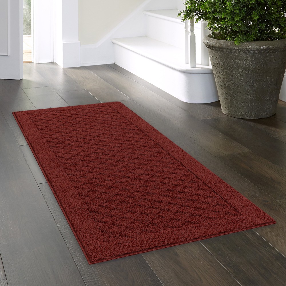 Product details Give any room a quick makeover with the Mainstays Dylan Solid Diamond 3-Piece Accent Rug Set. It has a classic design that will add a touch of style to any room or area it is placed in. This 3-piece rug set includes a 1'8"x2'6" accent rug, 1'9"x5' runner and a 2'6"x3'10" accent rug. The Mainstays 3-piece rug set features a durable, stain and fade resistant olefin yarn construction that allow it to handle the heavy-traffic areas of your home. It is available in seven colors including Pewter Gray, Red, Black, Beige, Blue, Navy and Brown. It is the ideal rug to add to your entryway, hallway living room, dining room, or bedroom. All sizes feature a non-skid latex backing. This Mainstays Dylan Olefin 3-Piece Accent Rug Set will upgrade the setting of any room your home. 100 percent Olefin yarn Solid Color High Low Loop Construction 0.56 Inch Pile Height Skid-Resistant Latex Backing Stain and Fade Resistant 3-Piece set includes 1'8"x2'6" and 2'6"x3'10" Accent Rugs and 1'8"x5' Runner Rug Red Colorway Machine Washable Machine Tufted in United States Indoor Use Mainstays Brand