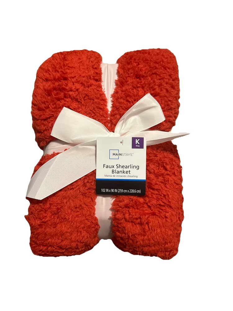 This Mainstays Faux Shearling Blanket is a red King size thermal blanket measuring 102" x 90". Made of 50% Recycled Polyester and 50% Polyester, it features a solid color with a red X character design. The blanket is machine washable and reversible, making it a cozy addition to any adult's bedroom.