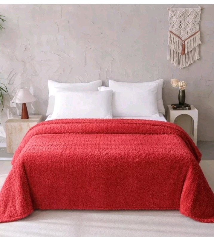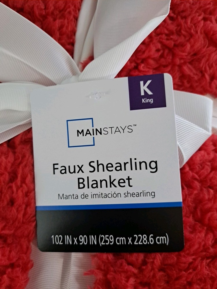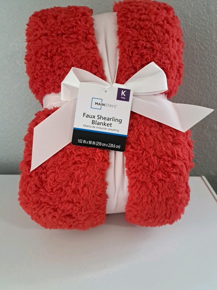 The Mainstays Faux Shearling Blanket in Red is designed for a King-size bed and measures 102 inches by 90 inches, suitable for adults. This blanket features a cozy faux shearling material that provides warmth and comfort. Perfect for adding a touch of luxury to your bedroom decor, this blanket offers a stylish and practical way to stay warm during colder nights. Be sure to check all shipping options offered. If you have any questions, please ask before buying. All sales are final. Thank you
