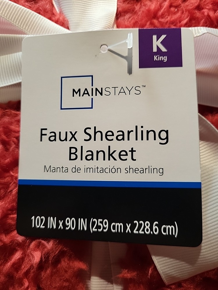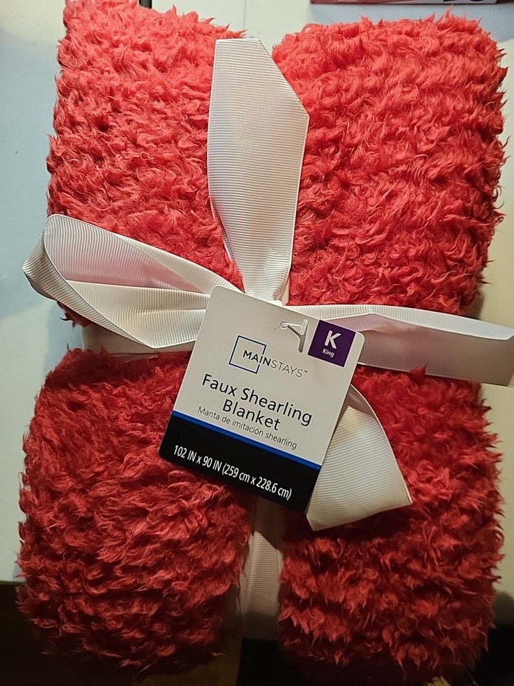 This Mainstays Faux Shearling Blanket in red is a king-size blanket measuring 102 inches in length and 90 inches in width. Made of a polyester blend with 50% recycled polyester, it is super soft and machine washable. Suitable for adults, this cozy blanket is perfect for any room in the house, providing comfort and warmth on chilly days.