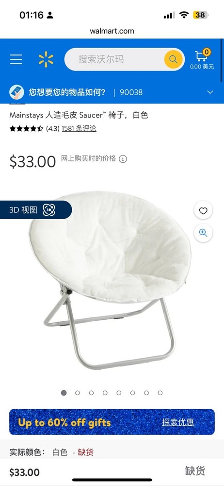 Mainstays White Faux Fur Saucer Chair for Cozy Comfort
