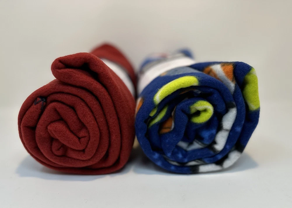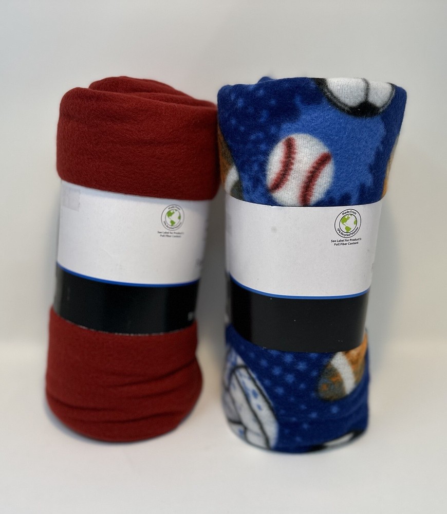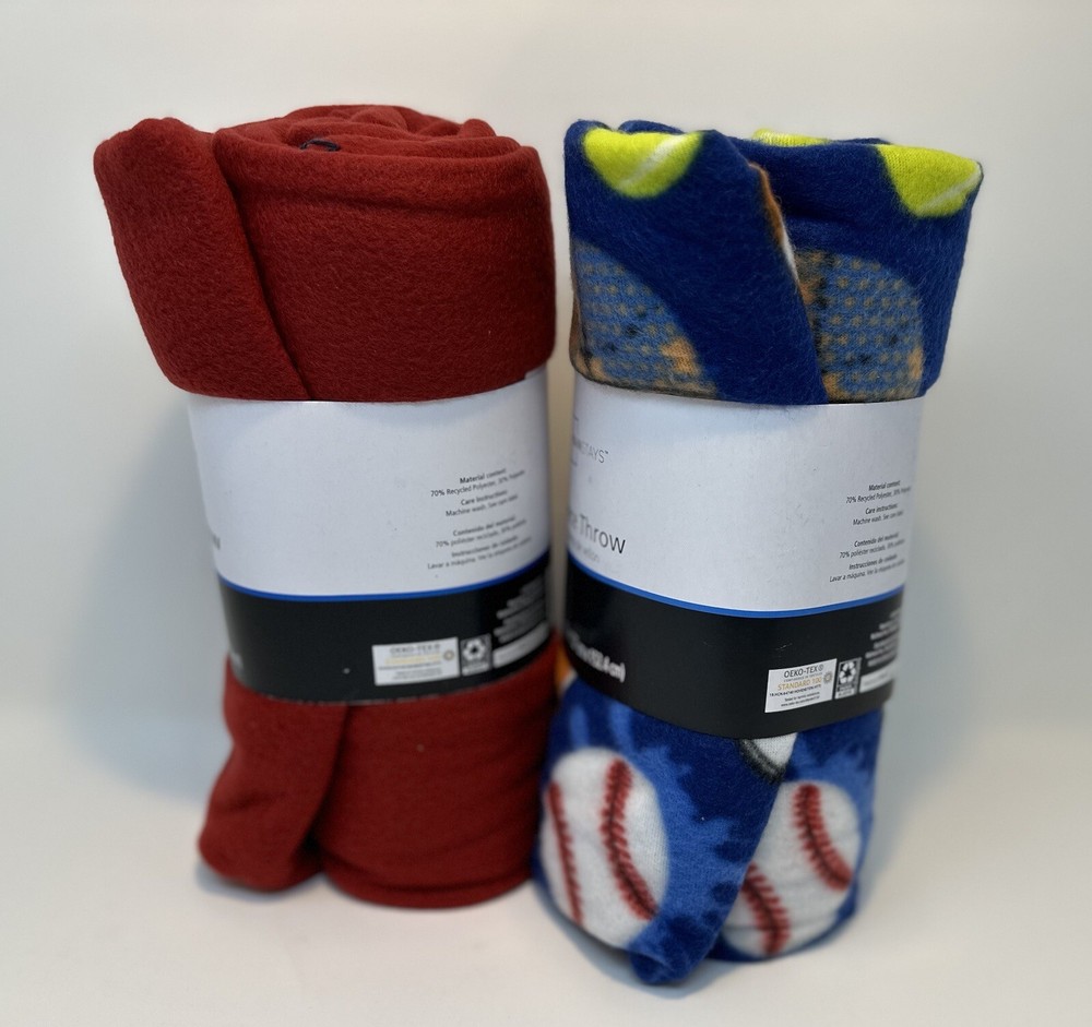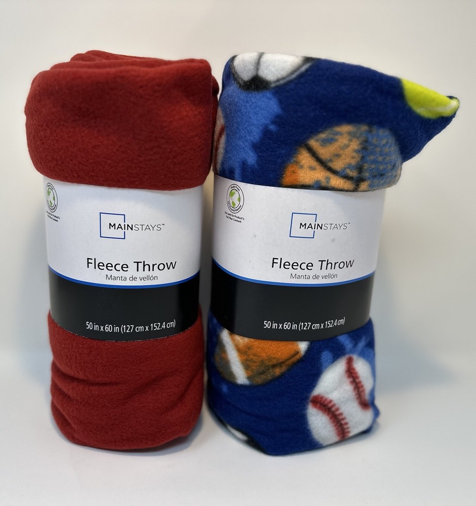 Mainstays Fleece Throw Blankets 50x60 Blue Sports Balls Solid Red Sedona 2 Pack Stay cozy and warm with these Mainstays Fleece Throw Blankets in a solid and sports balls pattern. Both Measuring 50 x 60 inches, these rectangular blankets are perfect for the bedroom or living room. The blue and red color combination adds a modern touch to your home decor. Made with soft fleece material, these blankets are machine washable and easy to care for. The blankets comes in a pack of two, making it a perfect gift for teens, adults, and kids who love sports and want to stay warm during the colder months.