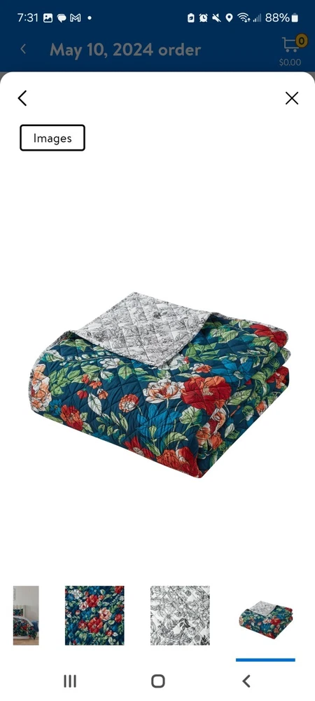 Add a touch of farmhouse elegance to your bedroom with this beautiful Mainstays Floral Red/Blue Floral Polyester Quilt. The queen/full-sized quilt features a lovely floral pattern in shades of red and blue, making it a perfect addition to any bedroom decor. The quilt is made of high-quality polyester material and is machine washable for easy maintenance. This reminds me of a beautiful hotel comforter or one of the pioneer women bedspreads, and sits at 86"X90". This reversible quilt is designed with a quilted feature that adds a unique texture and style to your bedroom. The care instructions are simple and easy to follow, making it a durable and long-lasting investment for your home. This foes not include shams or pillow cases. Perfect for adults, this quilt is ideal for any bedroom and is sure to impress your guests. It has a beautiful print of flowers on there.