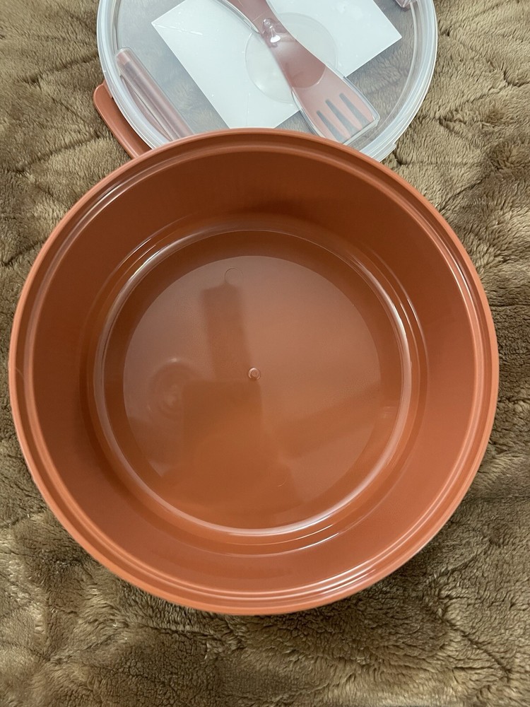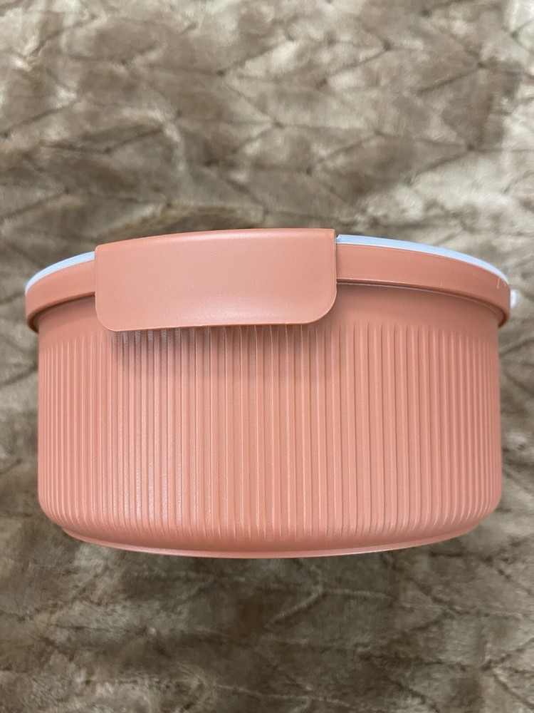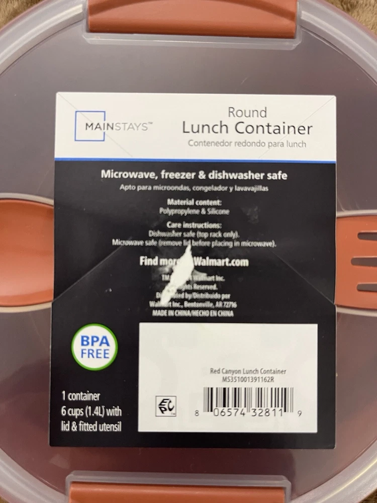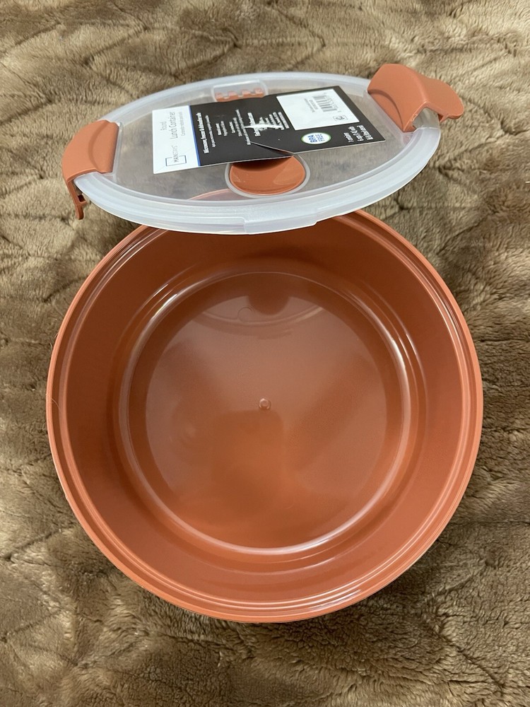 Mainstays Food Storage Container, Round, Copper Color, 47oz (6-Cups) Capacity Shipped USPS Brand new with tags Large capacity good for lunch size, capacity: 1.4L / 47oz Clear lid allow food view easily inside Convenience use with simple lock design Utensil come with the product, could be fit into the lid Translucent lid with solid container, airtight with silicone seal ring Product size: 11.82in L x 6.81in W x 3.11in H BPA free, Microwave, Freezer & Top rack dishwasher Fast shipping