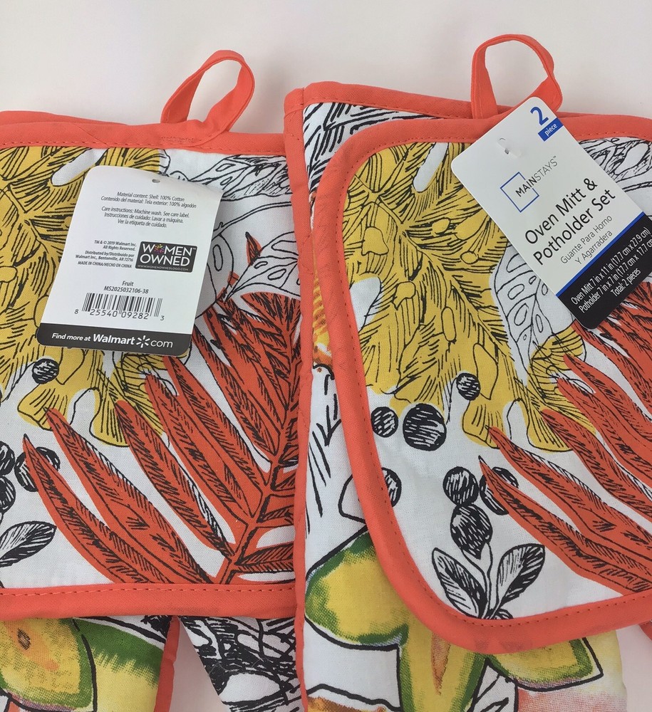 HERE NEW WITH TAGS IS A OVEN MITT & POT HOLDER SET PLUS YOU GET 2 KITCHEN TOWELS.THE ITEMS PICTURED IS THE EXACT 4 ITEMS YOU WILL GET.SHIP TO U.S.STATES ONLY.IF ANY QUESTIONS PLEASE ASKS....