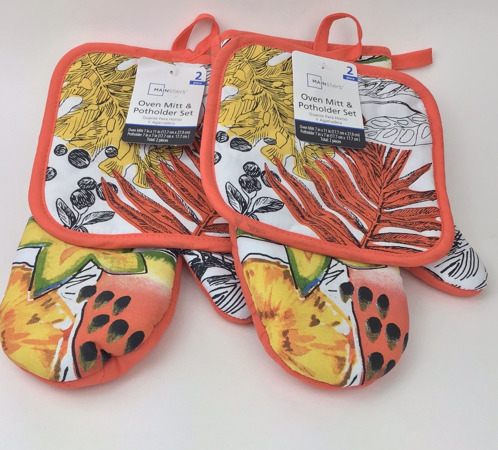 HERE NEW WITH TAGS IS A OVEN MITT & POT HOLDER SET PLUS YOU GET 2 KITCHEN TOWELS.THE ITEMS PICTURED IS THE EXACT 4 ITEMS YOU WILL GET.SHIP TO U.S.STATES ONLY.IF ANY QUESTIONS PLEASE ASKS.