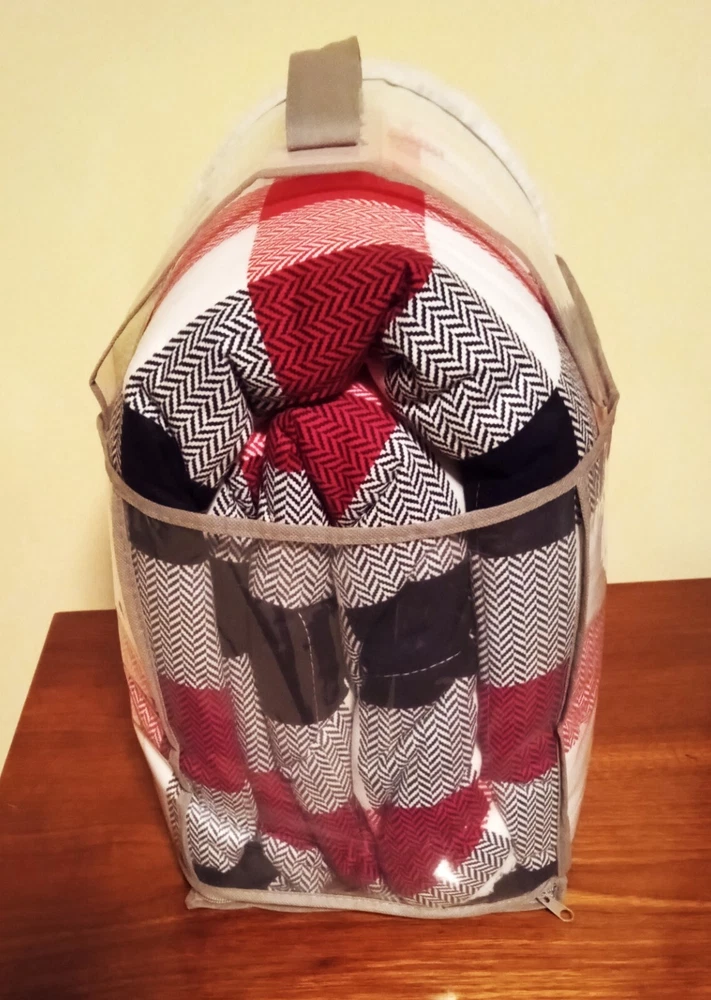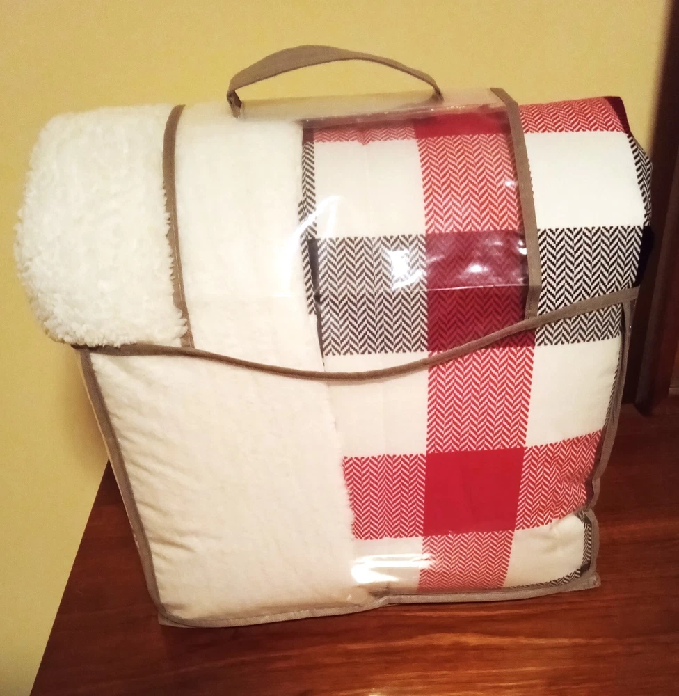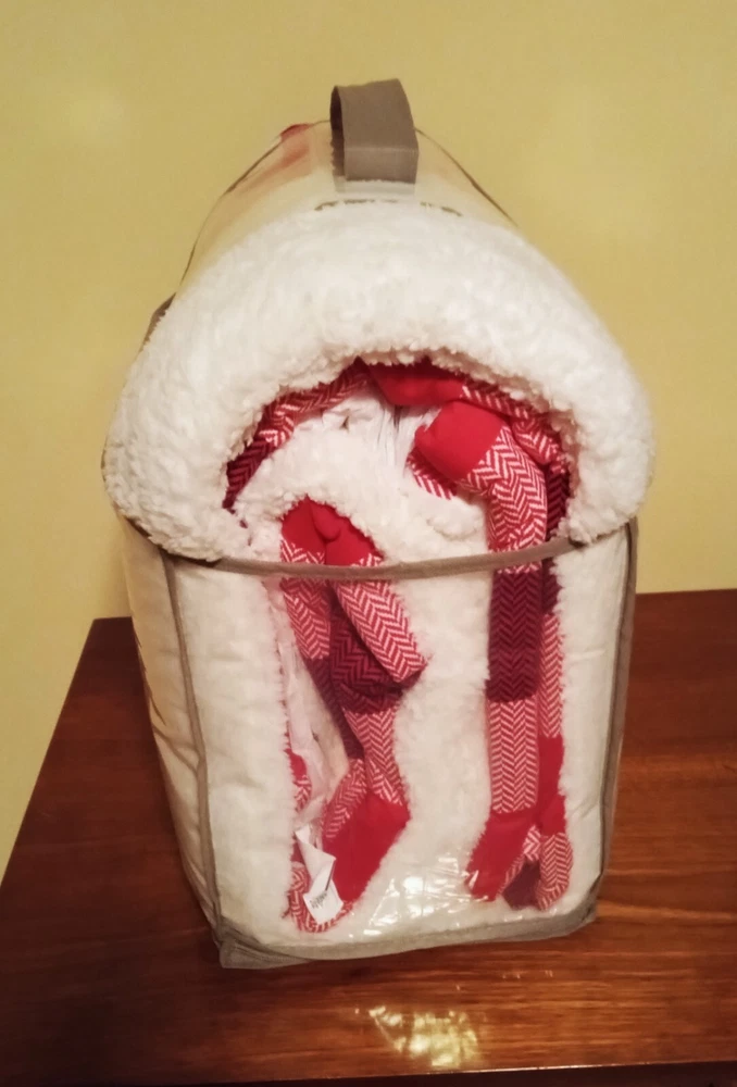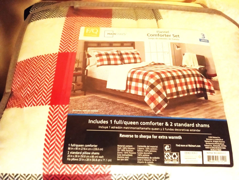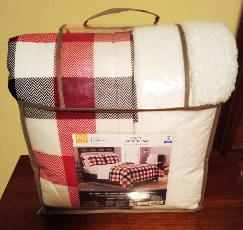 Warm & Cozy Flannel Comforter Set by Mainstays in a white, with red and black herringbone plaid squares. See pictures for best images. Includes 1 full/queen comforter & 2 standard shams. Reverses to sherpa for extra warmth. The comforter is 86 X 90 inches & the shams are 20 X26 inches. NEW in its original plastic zippered carry bag.