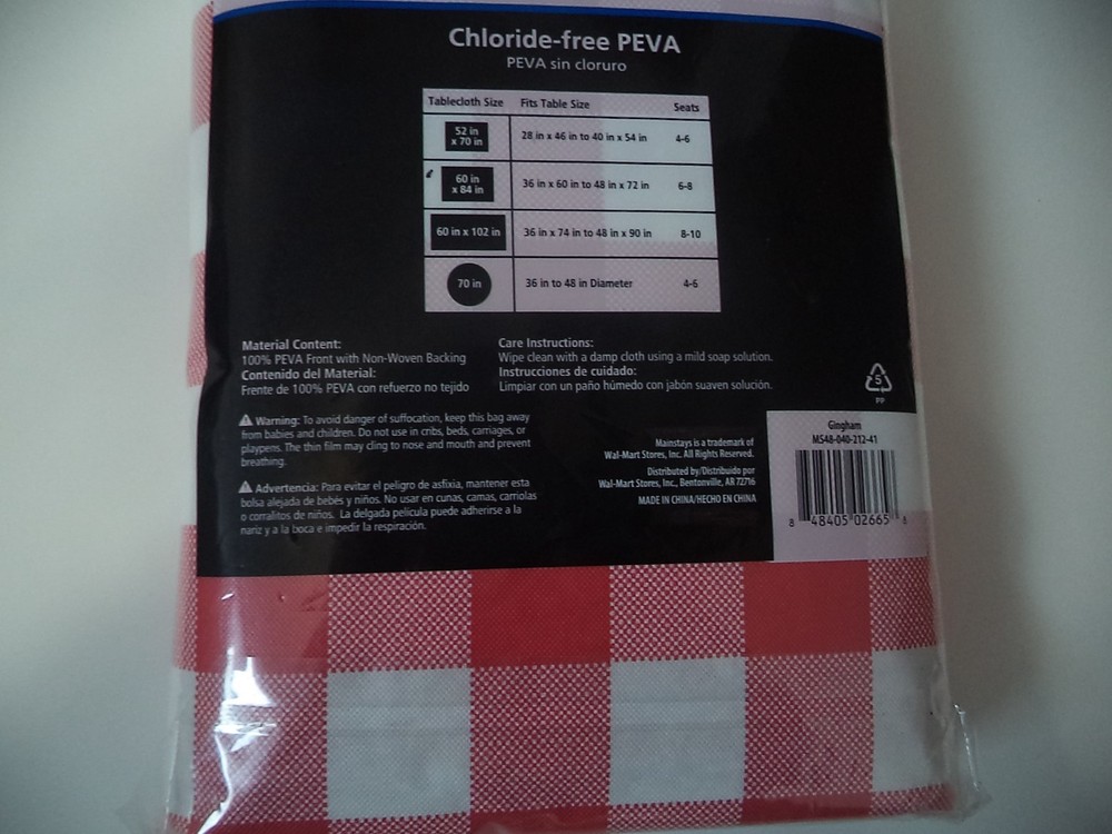 This is a brand new 60 Inch x 84 Inch PEVA Gingham Rectangular Tablecloth Chloride-free. Fits table size: 36 Inches x 60 Inches to 48 Inches x 72 Inches. Seats 6-8 Material content: 100 % PEVA Front with Non woven backing. Wipe clean with a damp cloth using a mild soap solution. Please keep all plastic bags and wrap away from children and babies to avoid danger of suffocation.