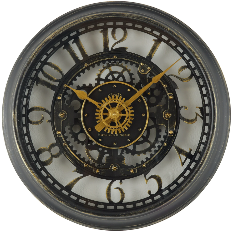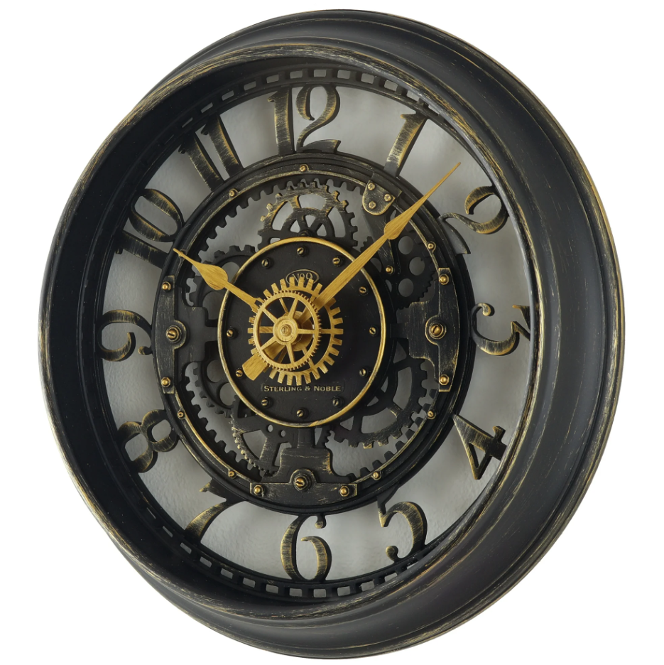Arabic Numbers Dimensional Decorative Gear Elements Glass Lens Hand-Applied Finish Metal Hands Quality Quartz Movement Plastic Frame Requires 1 "AA" battery to operate (battery not included)