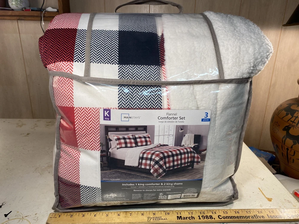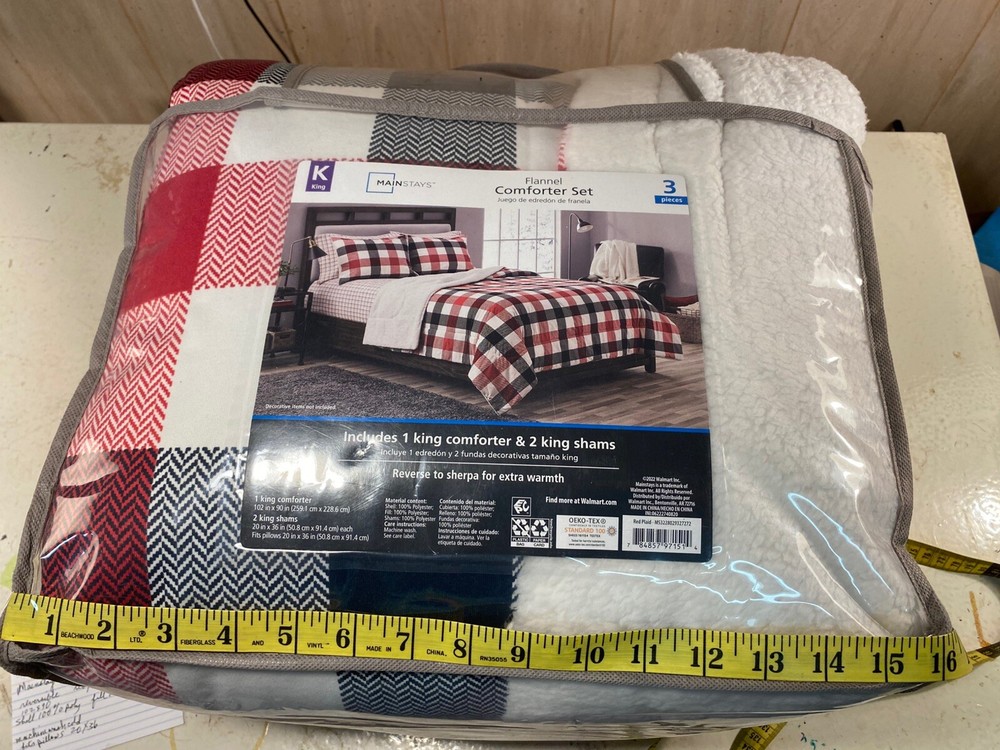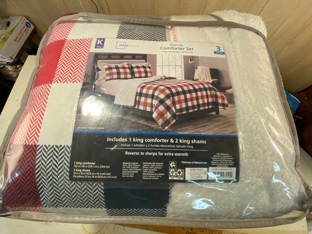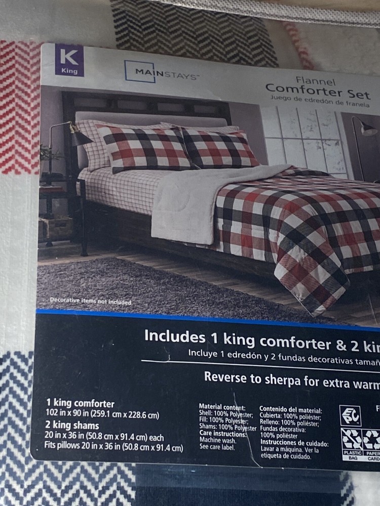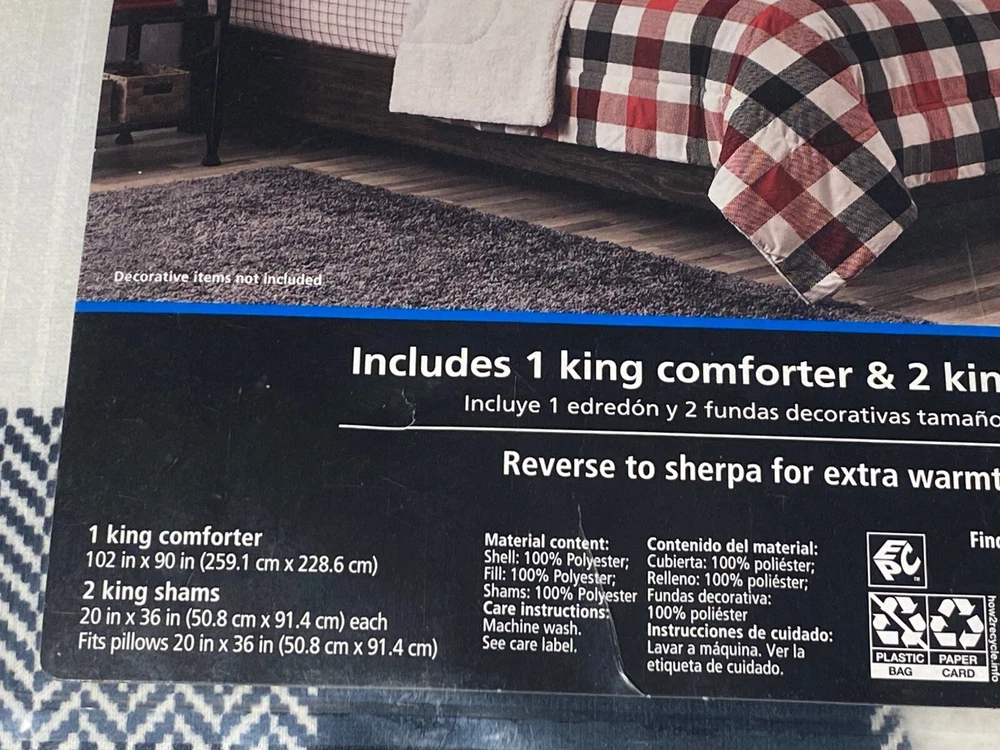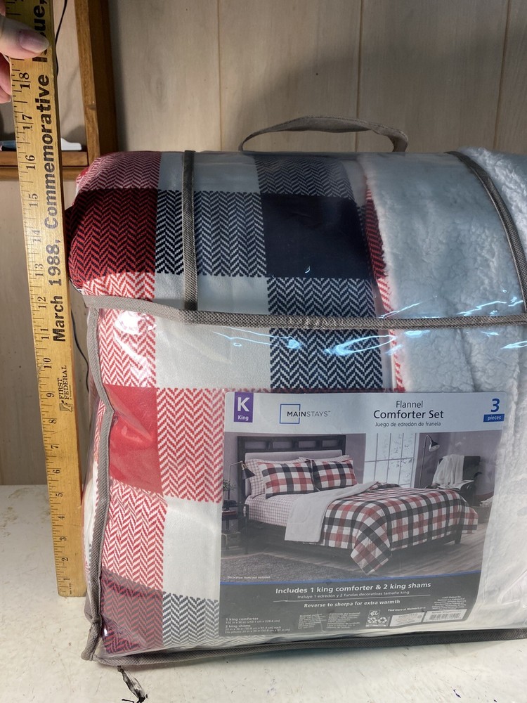 This is a brand new mainstays king size comforter set. Measures 102 ” x 90”. Red, black and white plaid , with sheepskin type material on other side. Fit s pillows 20” x 36”. Machine wash cold. New in package. You have free shipping on this . Weighs 9 lbs. Please refer to photos. They are part of description. From a non- smoking pet free home. Hope you have a good day. J79shelf12tier2