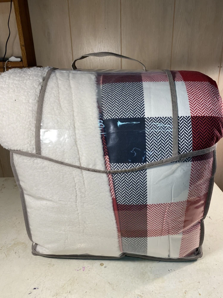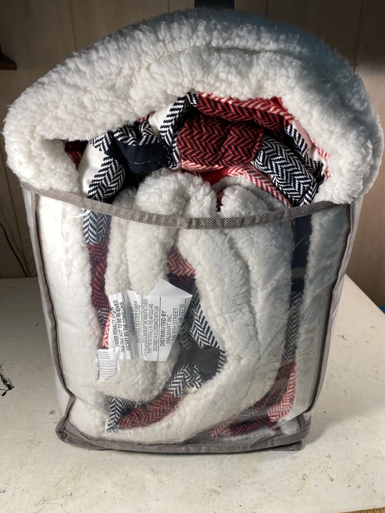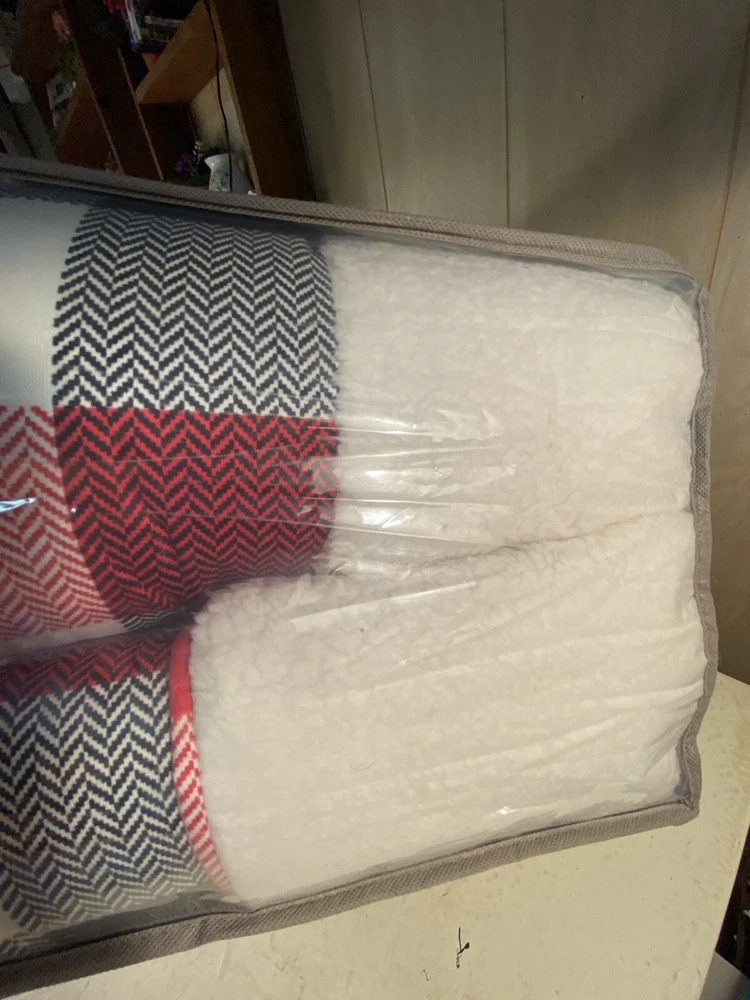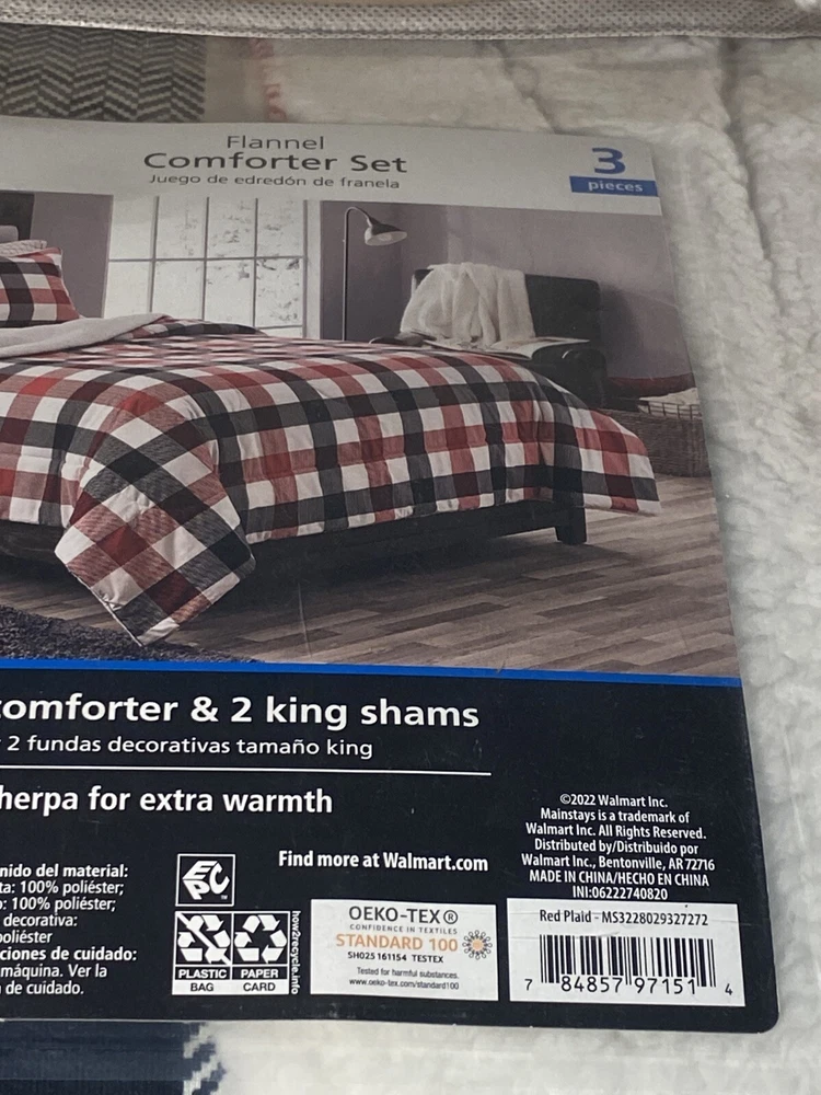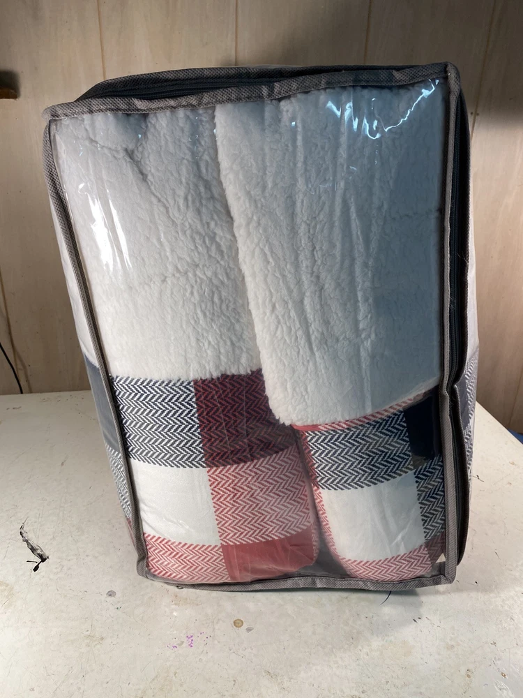 This is a brand new mainstays king size comforter set. Measures 102 ” x 90”. Red, black and white plaid , with sheepskin type material on other side. Fit s pillows 20” x 36”. Machine wash cold. New in package. You have free shipping on this . Weighs 9 lbs. Please refer to photos. They are part of description. From a non- smoking pet free home. Hope you have a good day. J79shelf12tier2