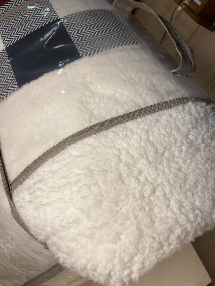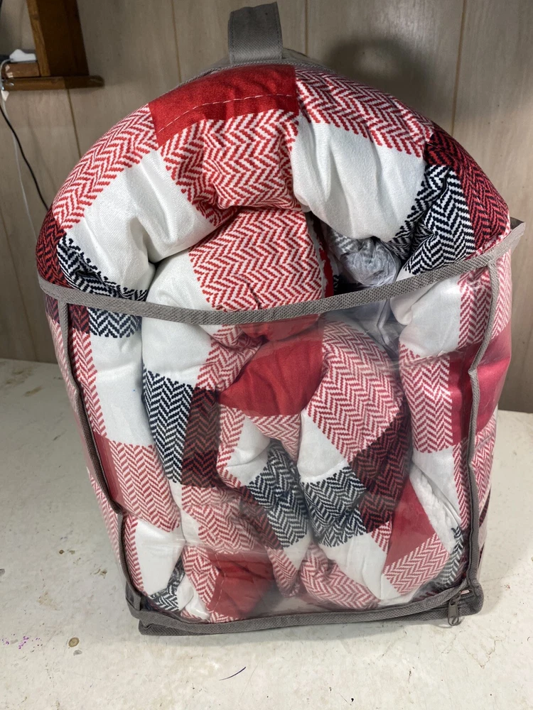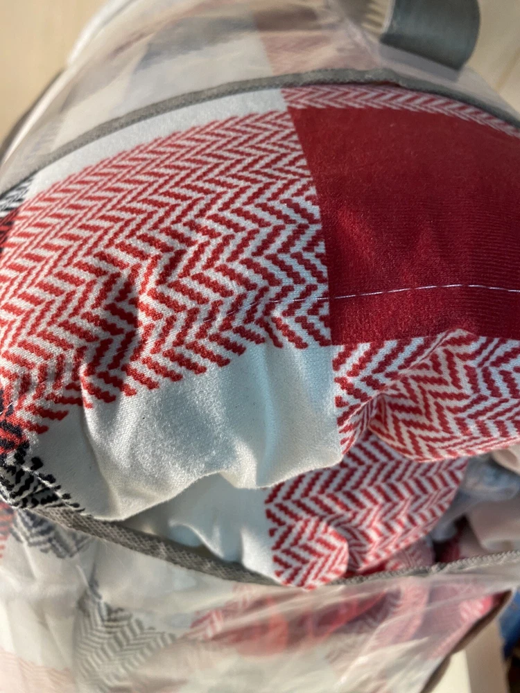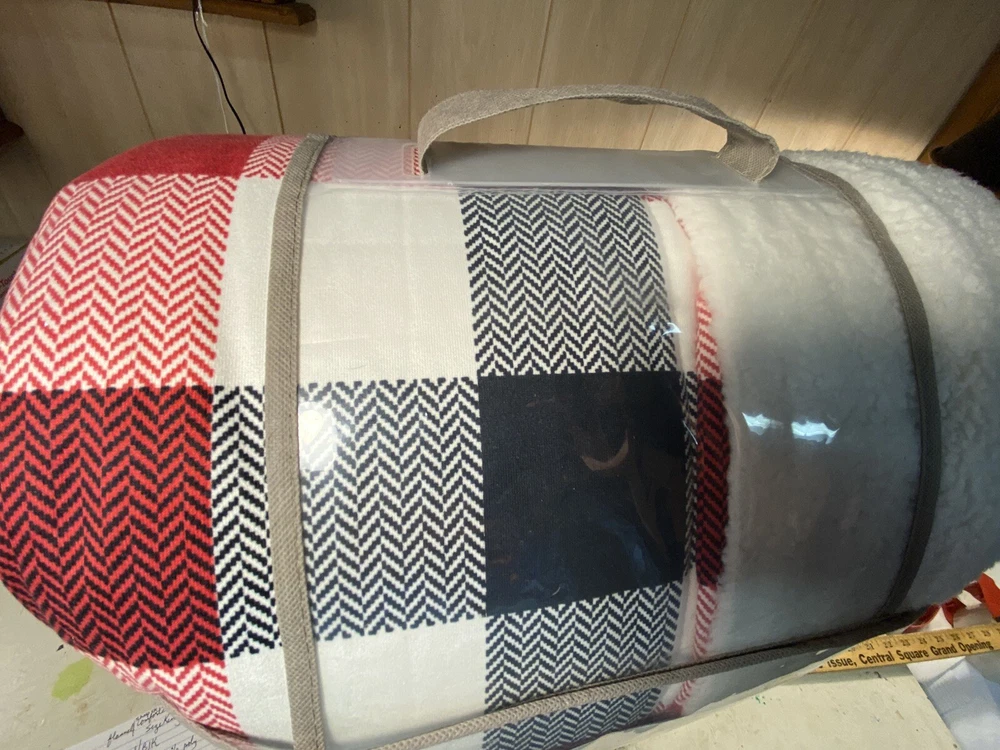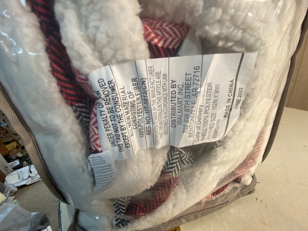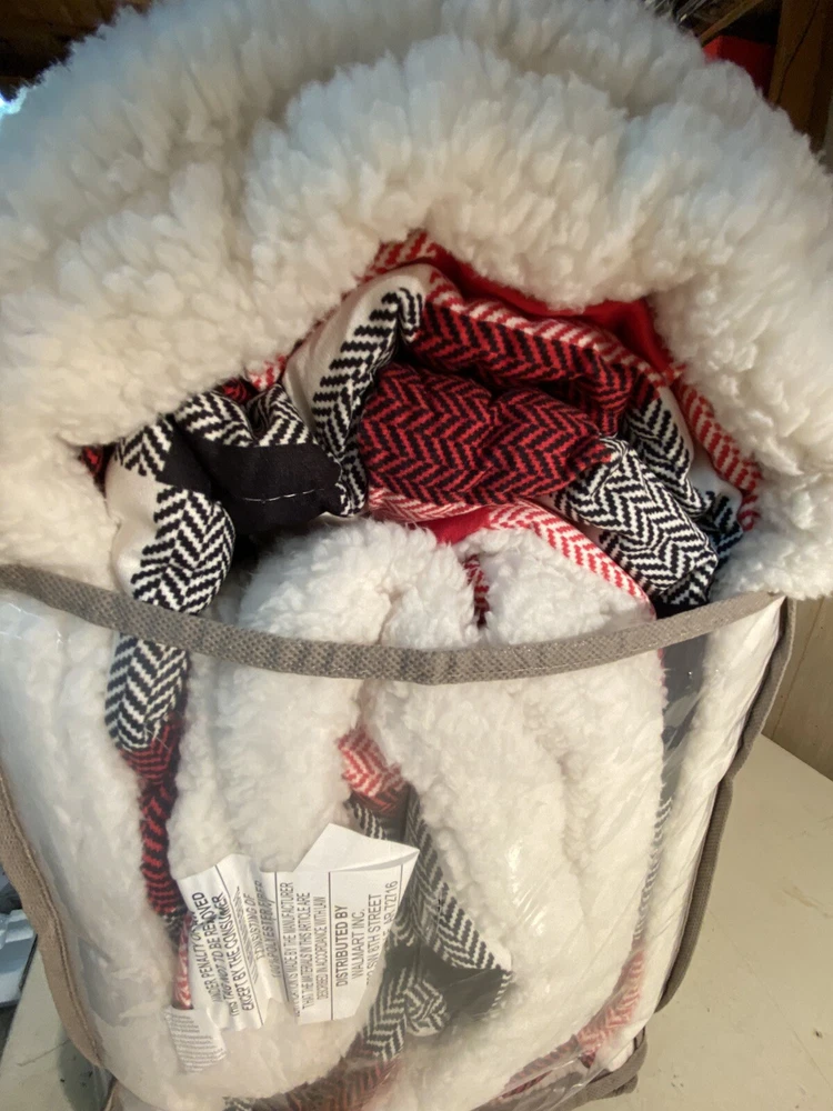 This is a brand new mainstays king size comforter set. Measures 102 ” x 90”. Red, black and white plaid , with sheepskin type material on other side. Fit s pillows 20” x 36”. Machine wash cold. New in package. You have free shipping on this . Weighs 9 lbs. Please refer to photos. They are part of description. From a non- smoking pet free home. Hope you have a good day. J79shelf12tier2