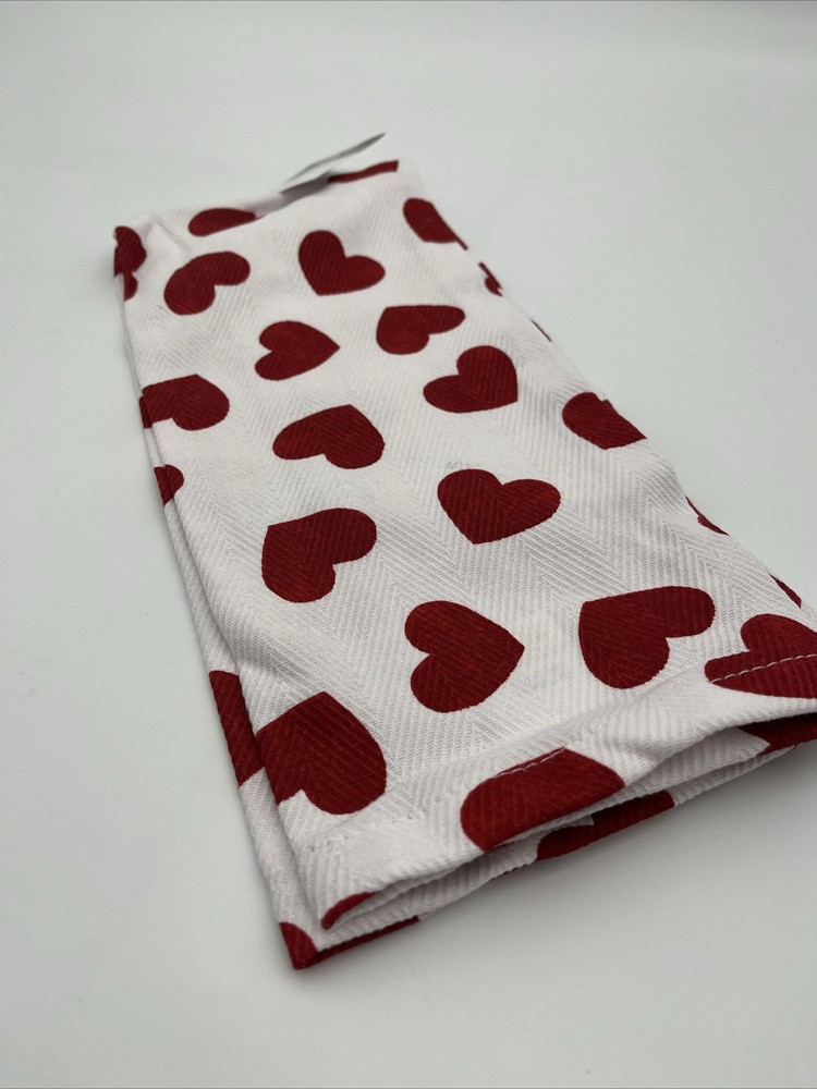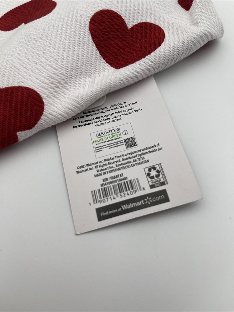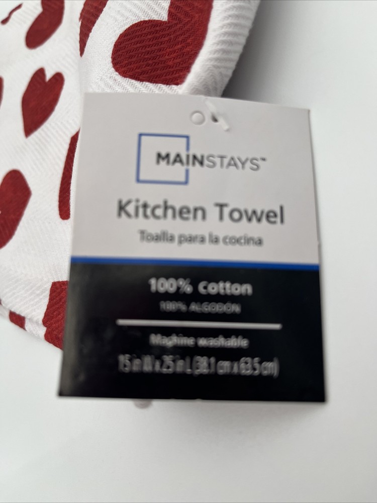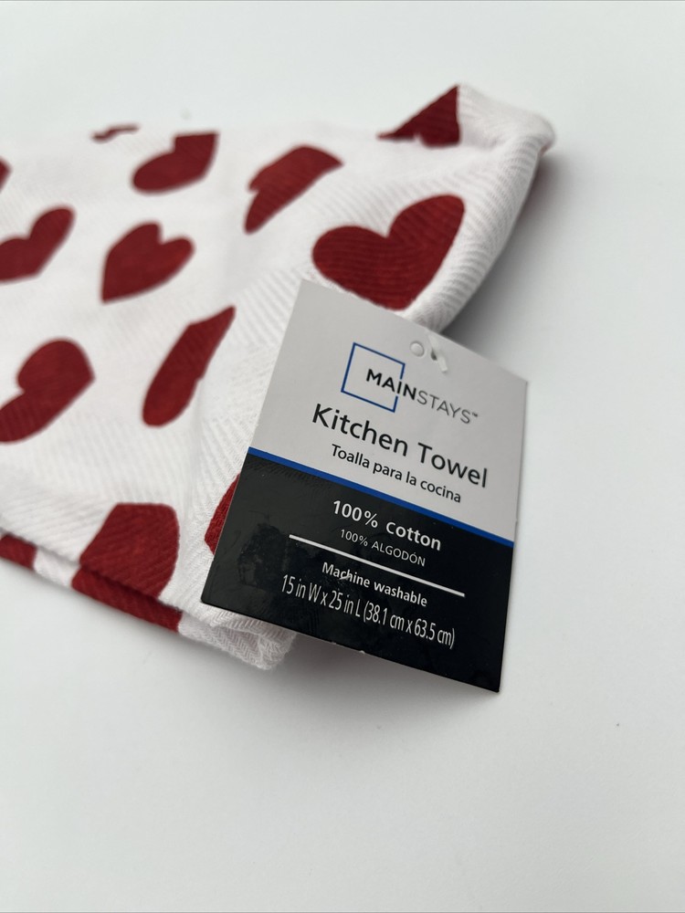 The Mainstays Kitchen Towel features a Big Heart pattern in white and red, making it suitable for various occasions like sympathy, birthdays, or Mother's Day. Made from 100% cotton, this traditional-style tea towel is machine washable and measures 25 inches in length and 15 inches in width. With a love-themed design, this versatile towel can be used for kitchen tasks or as a thoughtful gift for different celebrations.