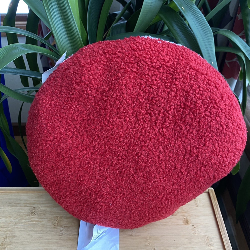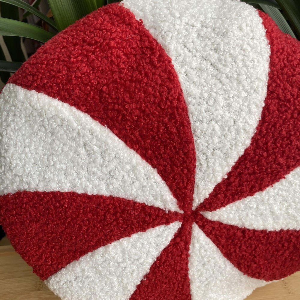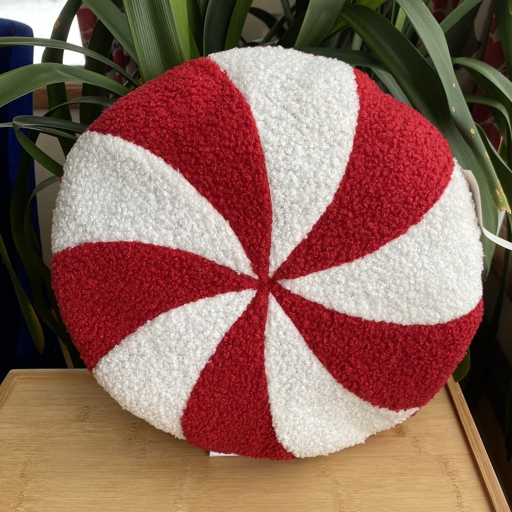 Mainstays MEDIUM Plush Sherpa PEPPERMINT PILLOW Round Christmas Candy RED White. Brand new with tag. Looks similar to the Pottery Barn Cozy Teddy pillow but for way less!