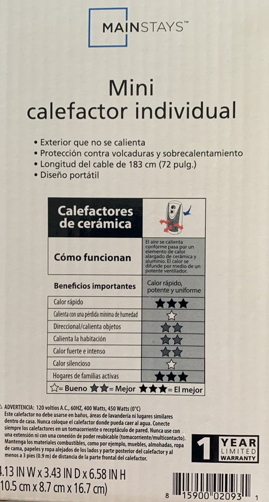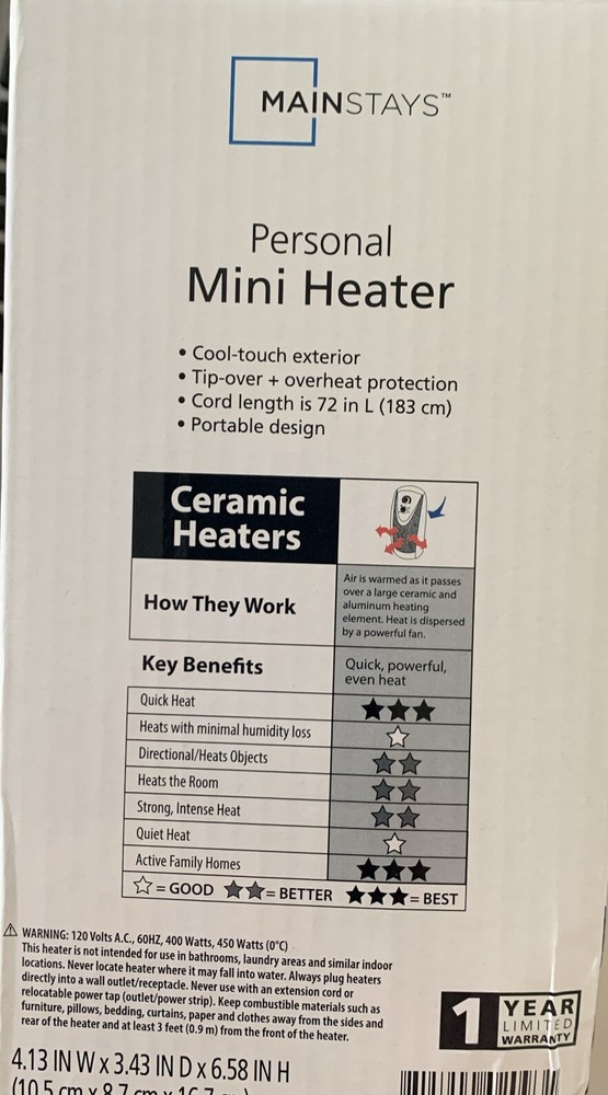 This personal mini electric ceramic heater is a must-have for anyone looking to keep their indoor space warm and cozy. The heater has a power source of 120V and a power of 400W, making it highly efficient and effective in heating small areas. The heater is designed with a ceramic heating system that ensures even and efficient heat distribution. The Mainstays MH-16B Personal Mini Electric Ceramic Heater is available in a vibrant red color and is made of high-quality ceramic material. It is a portable heater that can be easily moved from room to room, making it a perfect addition to any home or office. Get this space heater today and enjoy the warmth and comfort it provides!