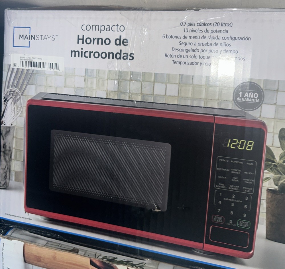 The Mainstays MSF0R100072352 Countertop Microwave Oven is a compact and versatile appliance designed to meet your quick cooking needs. With a 0.7 cubic foot capacity and 700W power, it's ideal for reheating leftovers or defrosting frozen foods. The microwave features a range of 10 settings/programs, including an automatic option for ease of use. Sleek in a red finish with a black glass finish, it complements any kitchen decor while the LED display and clock provide convenience and ease of timing. Safety is considered with a child safety lock, and its overall size, 10 inches in length, 6 inches in width, and 7 inches in height, makes it a perfect fit for small kitchens or as an additional microwave option.