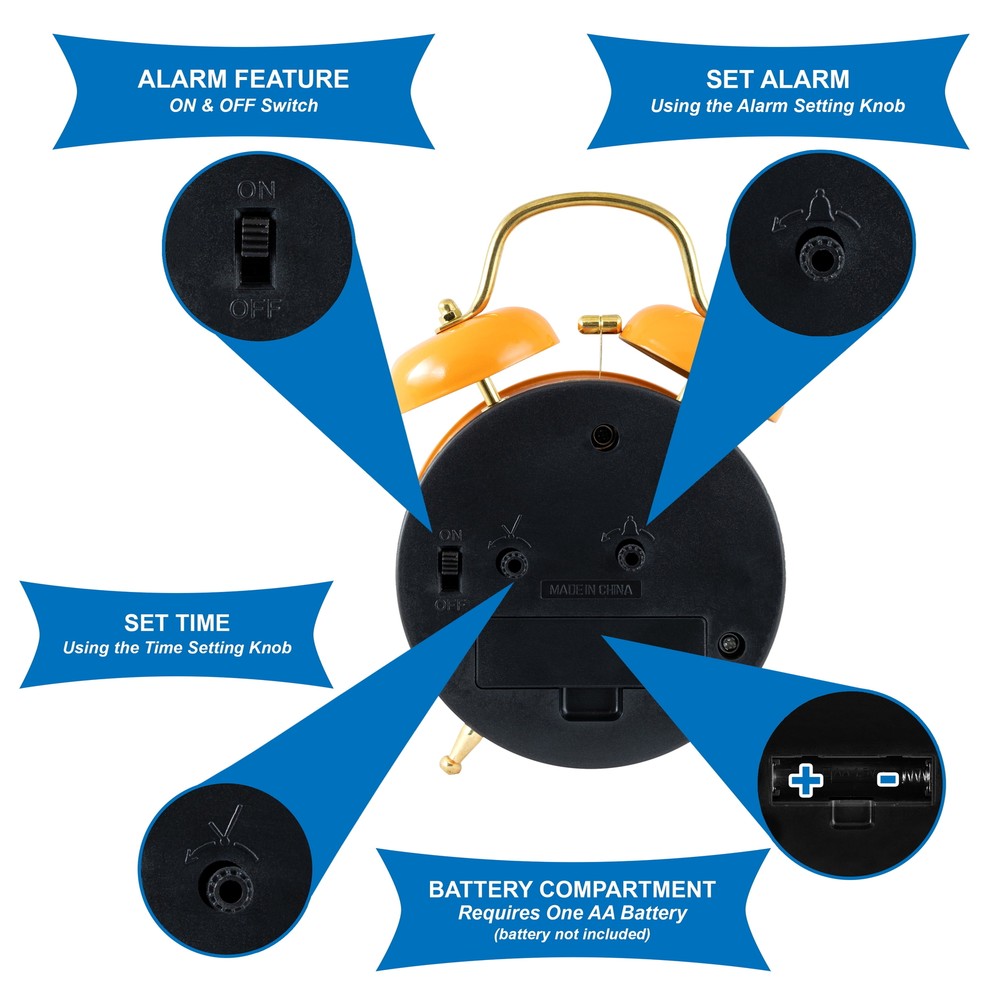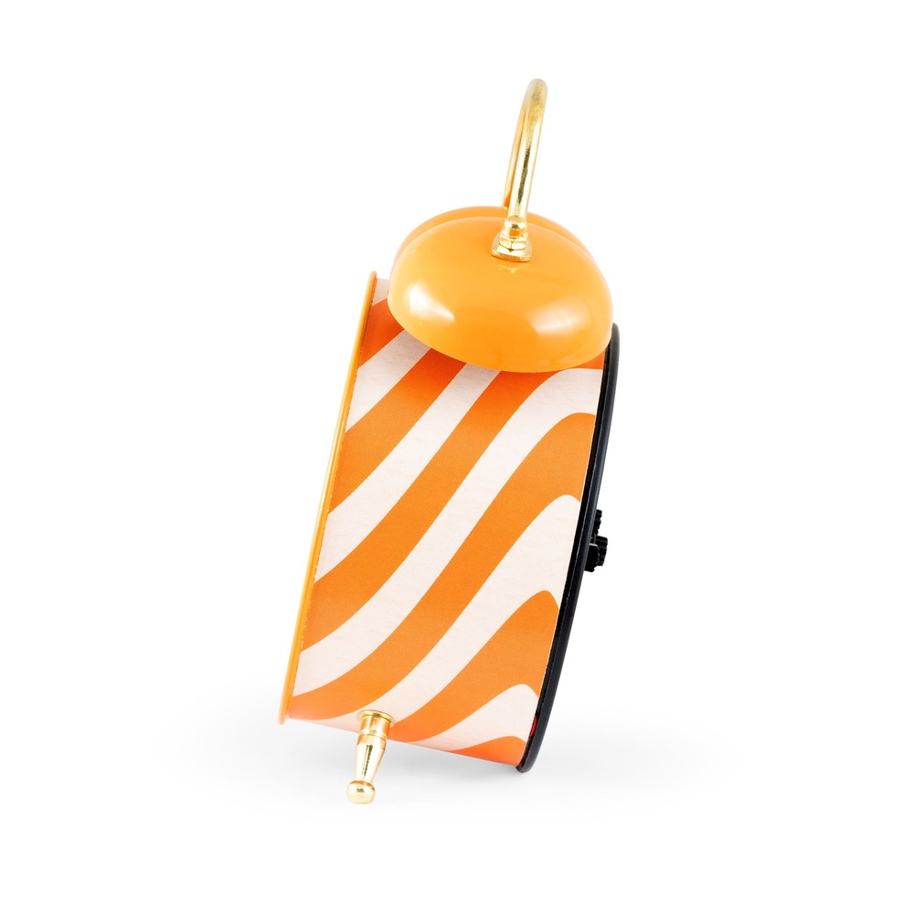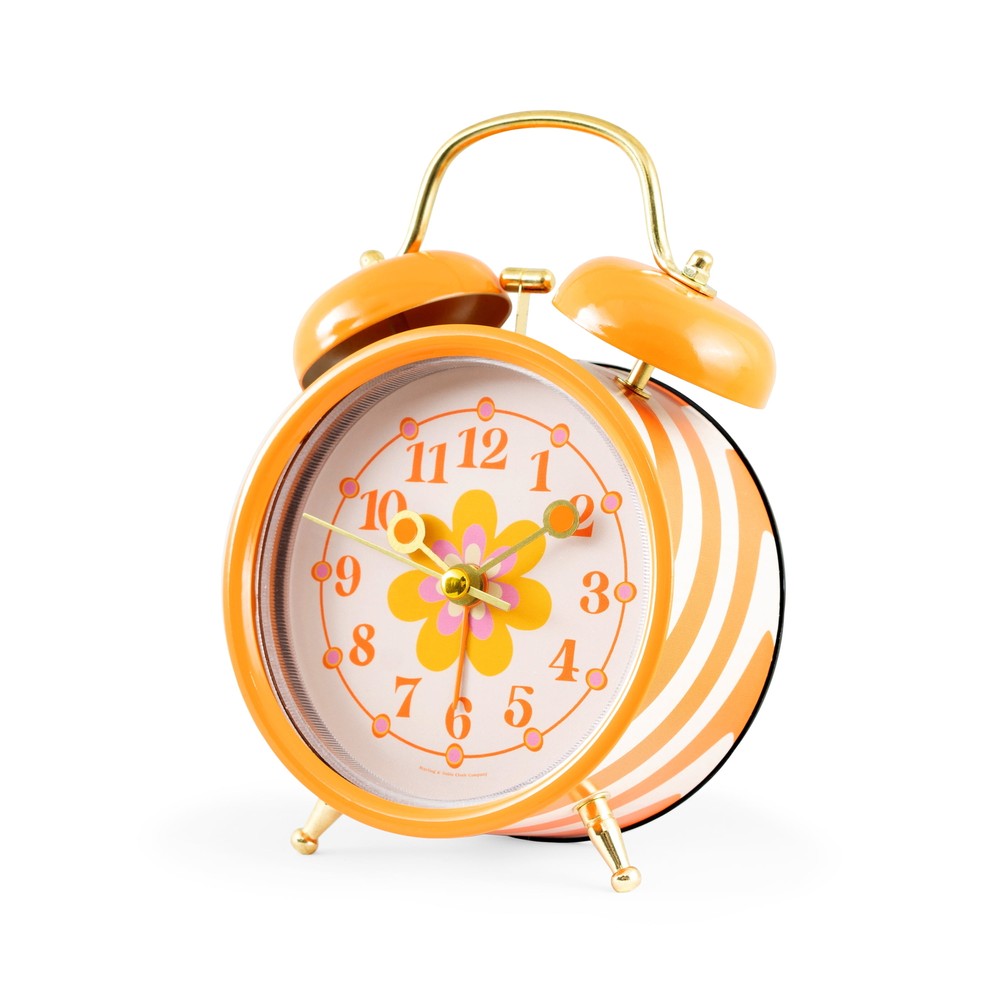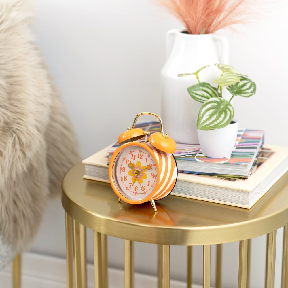 Product details Bring a fun sense of style to your space with this Mini Floral Clock! The classic double bell alarm clock design features a vibrant orange gloss finish with brass finished feet, alarm hammer and clock handle. The profile of the clock case is wrapped in a coordinating abstract orange and cream groovy wave pattern! The clock’s glass lens provides protection to the handset and dial. The hour and minute hands feature a mod-inspired hand design by their brass finish and orange dot silhouette! The orange alarm hand and brass second hand complete the design. The clock dial’s aesthetic features a mod flower motif at the center, encircled by a mod-inspired minute track. Hues of tangerine orange, marigold yellow and groovy pink enhance this dial’s captivating and lively design! Located at the back of the alarm clock, you’ll find the alarm on/off switch, time setting wheel, alarm setting wheel and battery terminal. Switch the alarm to the “on” position, set the orange alarm hand to your desired alarm time, and enjoy the vintage bell-style alarm! To cease the alarm, simply turn the alarm switch to the “off” position. Quality quartz movement ensures accurate timekeeping. Indoor use only. You will love how this Mini Floral Clock’s colorful style collides with the functionality of an alarm clock! Measuring at 3.75” wide by 2.25” deep x 5” tall, you can enjoy this clock as a nightstand clock, or even as an office desk clock! This Mini Floral Clock is a perfect addition to any space! Mini double bell alarm clock Requires 1 "AA" battery to operate (battery not included) Vintage/Mod/Groovy styling 3.75" wide x 2.25" deep x 6" tall Traditional bell-style alarm Orange patterned case Floral pattern dial (orange, yellow, and pink) Designed for indoor use only Brass finished metal hands and accents Made in China Quality quartz movement Metal case with glass lens
