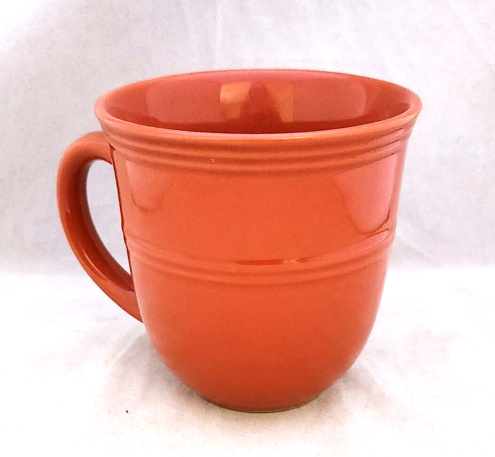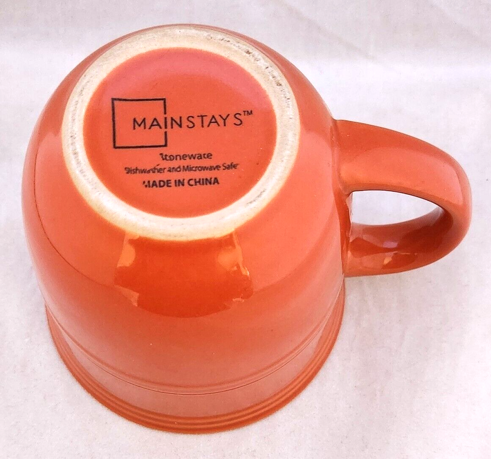 Mainstays Stoneware 14 oz Mug Orange Spice (Rainforest) Mainstays stoneware mug, in the Orange Spice (Rainforest) pattern, is all orange, with no trim and embossed rings and rim. Excellent pre-owned condition; no chips, no cracks, no crazing. 4" height x 4 1/8" diameter; 5 1/4" overall width Check out my other items for more great stuff. I will be happy to combine items to reduce shipping costs when possible if you win more than one item. Good Luck and Happy Bidding!