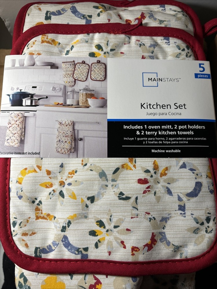 The versatile 5-piece kitchen set includes oven mitts, pot holders, and towels, designed to withstand high temperatures while adding a vibrant touch to any kitchen. The quilted design enhances grip and insulation, ensuring safety during cooking tasks. The multicolored floral pattern complements various kitchen decors. • Set includes oven mitt, two towels, and two pot holders • Quilted for better grip • Loop for hanging • Heat resistant BC