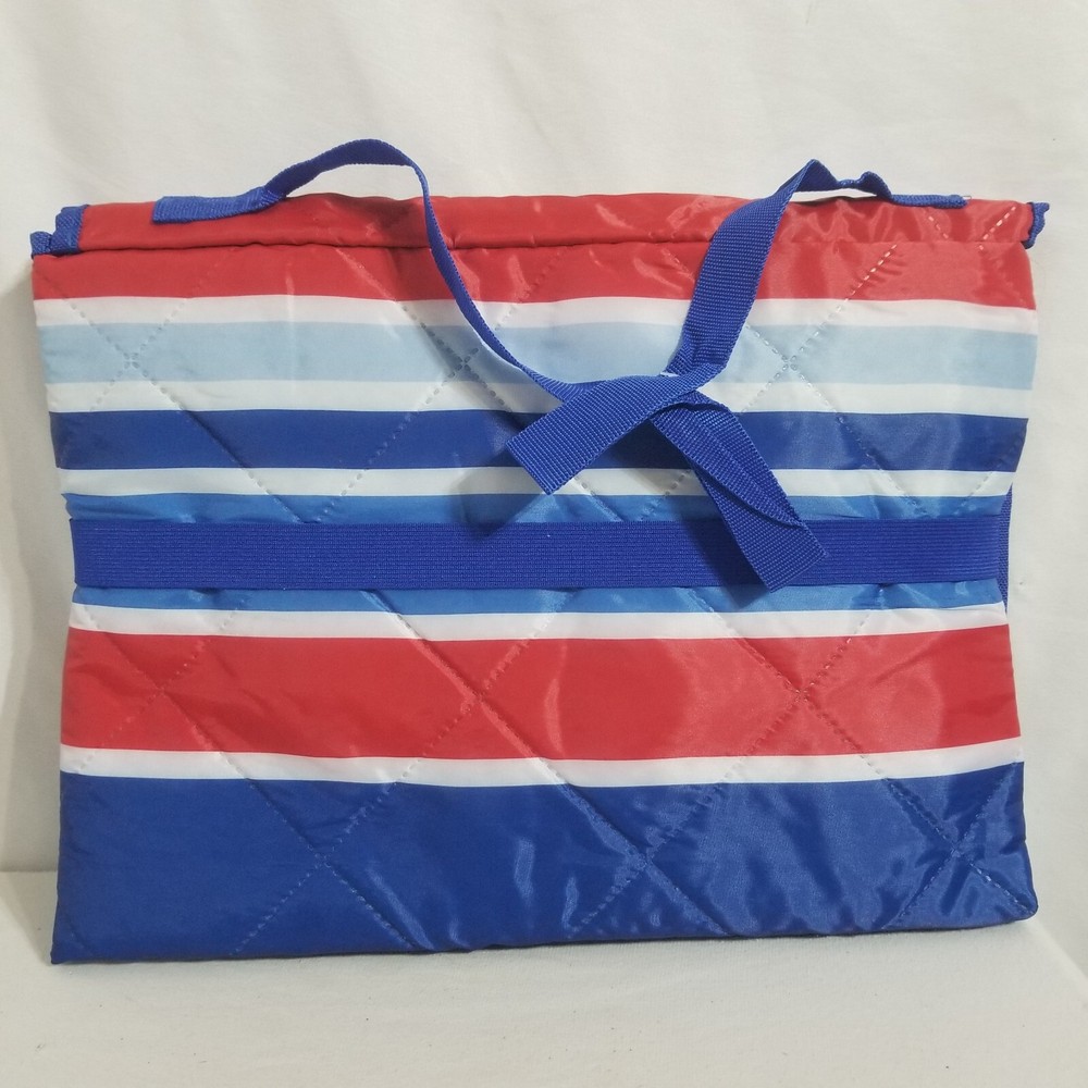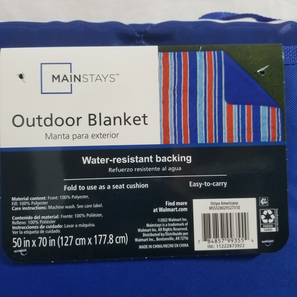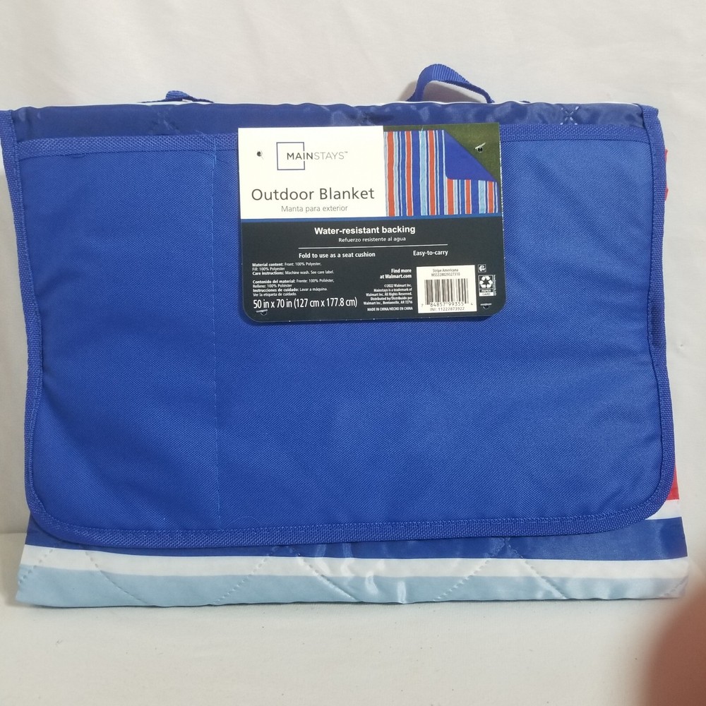 This Mainstays Outdoor Blanket in a patriotic red, white, and blue striped pattern is perfect for picnics, beach outings, or sports activities. Made of durable polyester material, it features a convenient carry strap for easy transportation and storage. With a generous size of 50” x 70”, this modern-style blanket is water-resistant at the bottom and can be machine washed for easy cleaning. Enjoy the comfort and style of this versatile outdoor blanket for all your backyard adventures.
