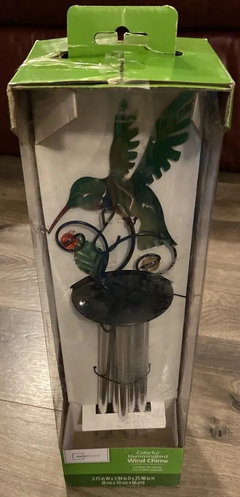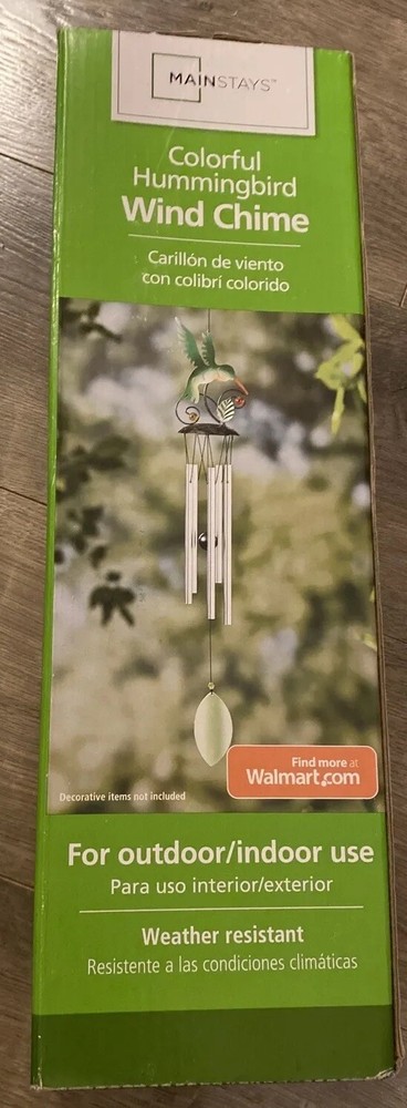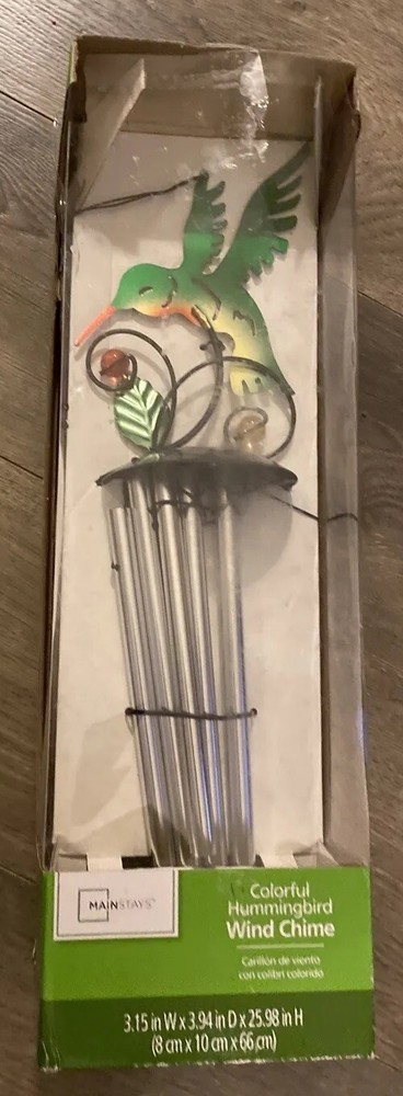 Mainstays Outdoors Wind Chime: Multicolored Hummingbird Wings Feathers NiB 3.25 Width 3.94 in diameter 25.98 in height. Blue bag