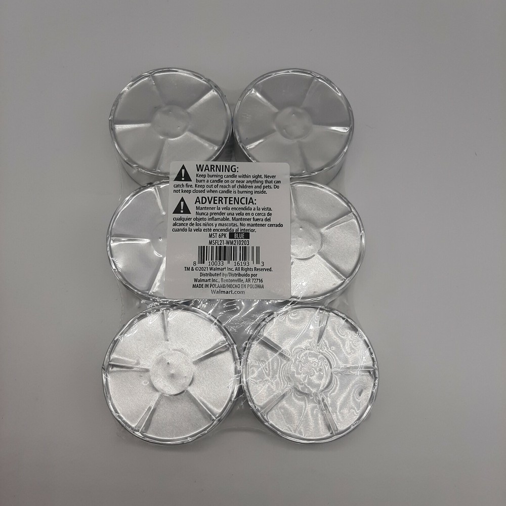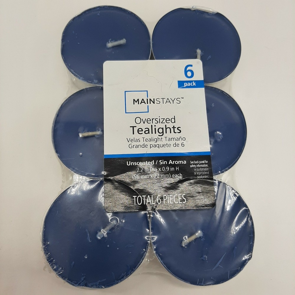 Light up your space with 3 sets of six Mainstays Oversized Tealight Candles. The colors are blue, green and red. Made of high-quality wax, these candles are perfect for any room and any occasion. Their modern style and romantic theme make them an excellent choice for creating a cozy atmosphere at home. Each candle is large in size and unscented, making them the perfect addition to your decor without overpowering the room with fragrance. The set comes in a pack of six, making it an economical choice for your candle needs. Enjoy the warm glow and ambiance these candles bring to your space without worrying about their condition.