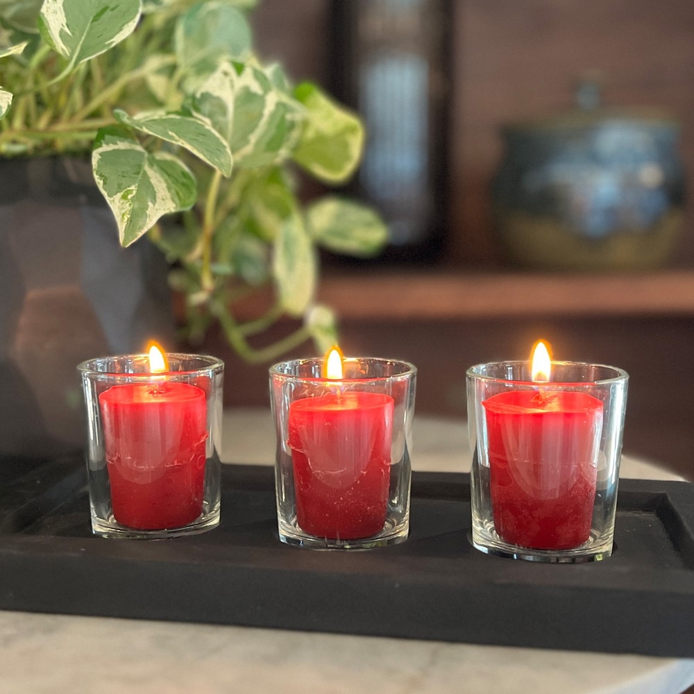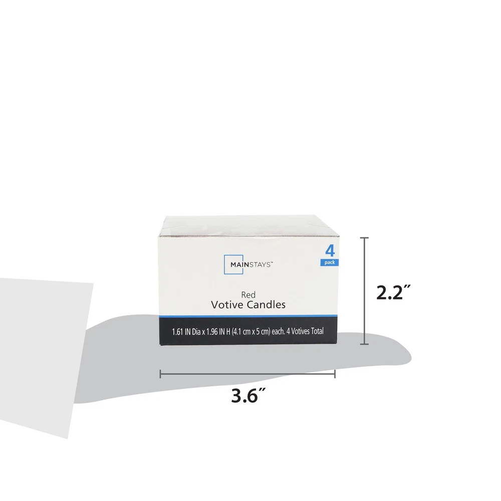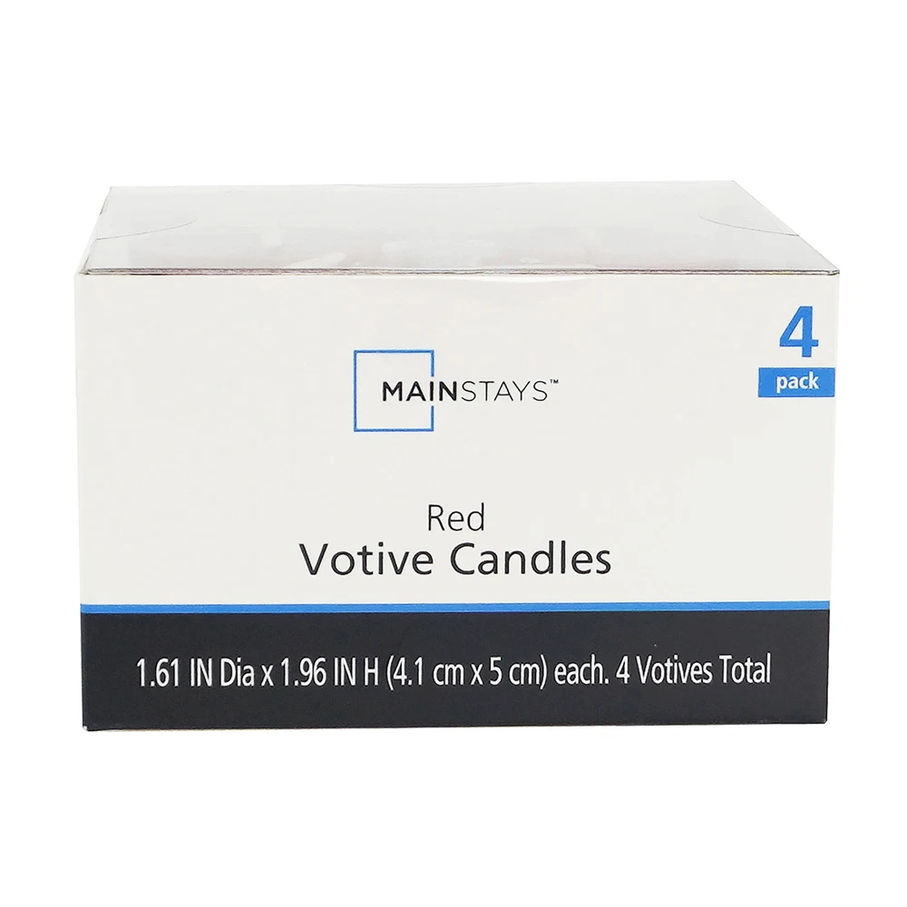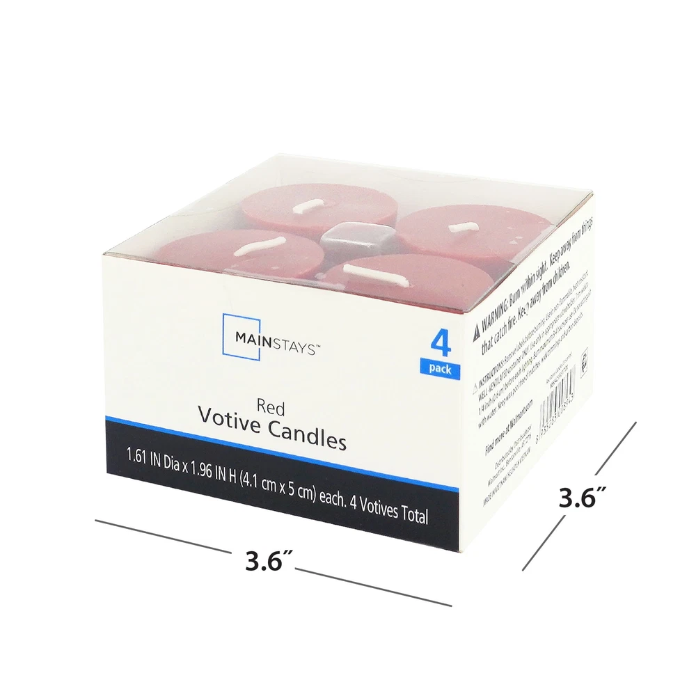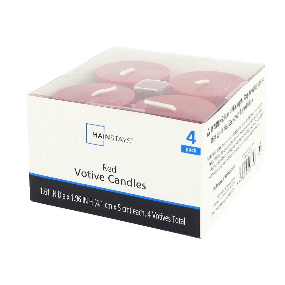 Brighten any space with Mainstays Votive Candles. These red candles are perfect for special occasions such as weddings, parties, and brightening your home décor. Use them as centerpieces, party favors, or window decorations. They're also perfectly sized for all kinds of decorations and even arts and crafts. Made from high-quality wax, these unscented candles provide a clean and consistent burn. Pair them with other unscented Mainstays Candles, like mottled pillars and tapers, for a coordinated and organized look. Always use with a glass tray or candle holder, and keep away from children, pets, and flammable objects. Enjoy the warm glow of Mainstays Votive Candles. On May 8, 2025 at 03:59:07 PDT, seller added the following information: