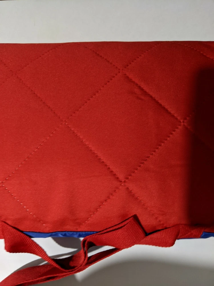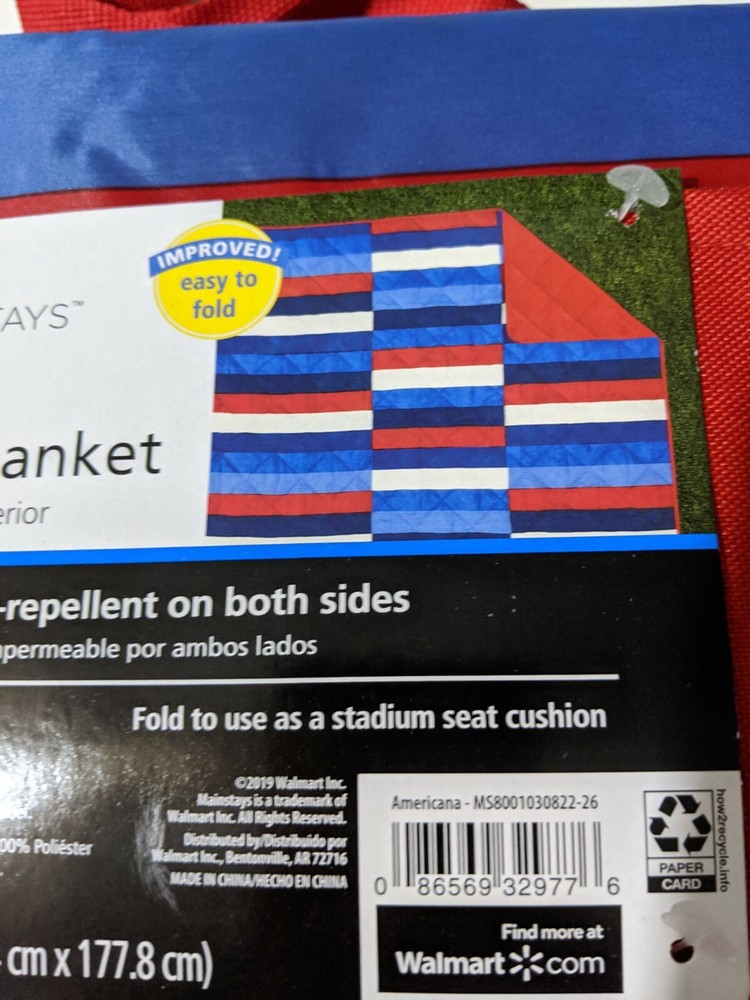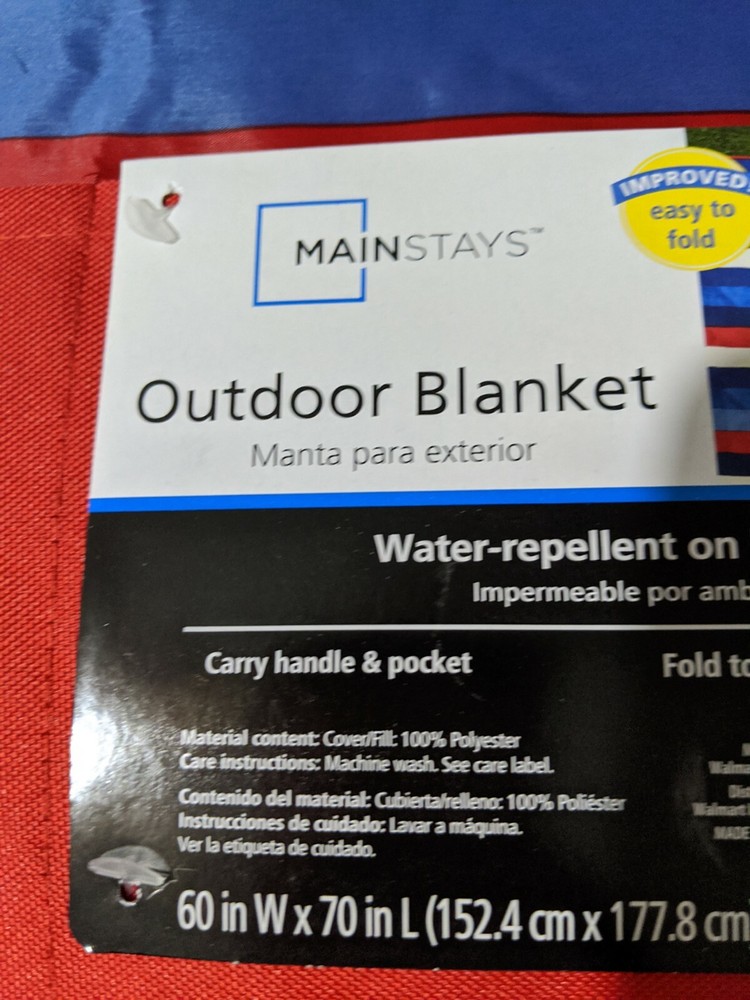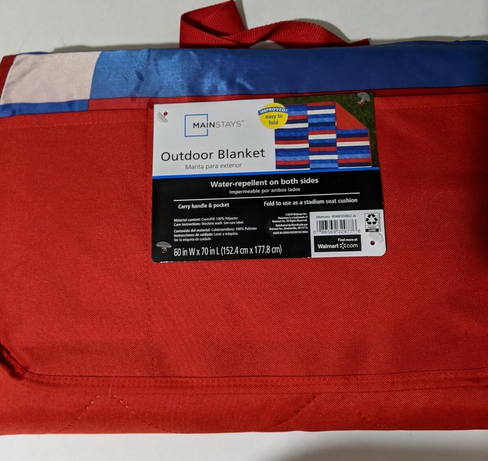 Mainstays Patriotic Red, White and Blue outdoor blanket. Water repellant and perfect for picnics, sporting events or a stadium seat! This blanket measures 60 inches Wide and 70 inches long. Has velcro closure and is easily folded up amd has a handle for easy carrying. Brand new!
