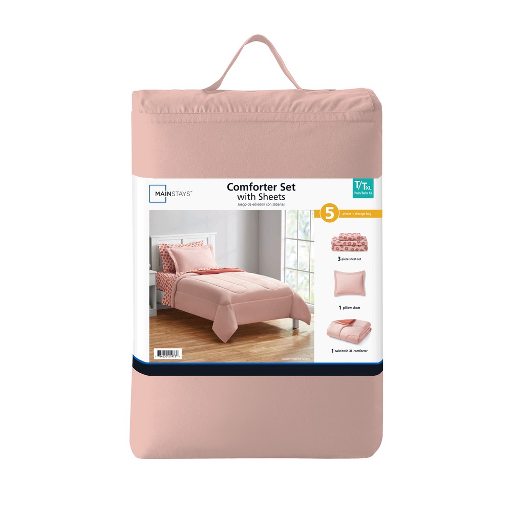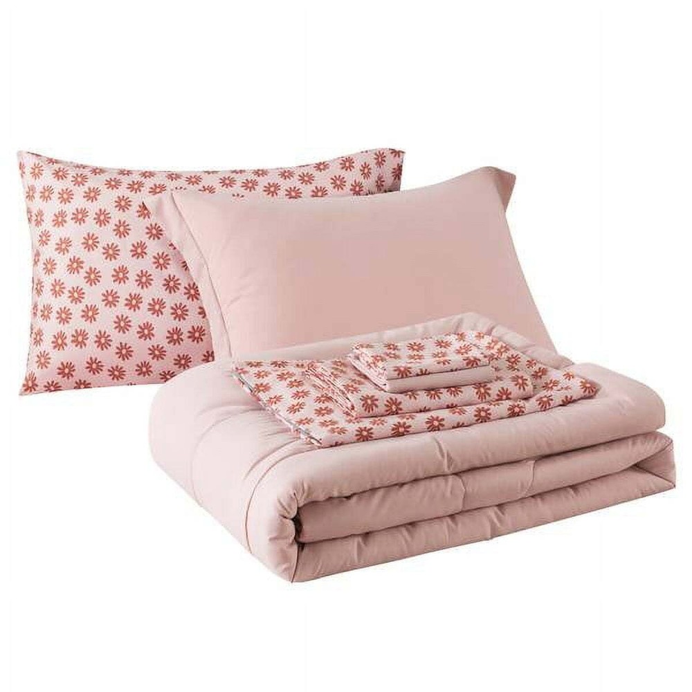 Brighten up your room with the soft pink reversible Bed-in-a-Bag Comforter Set which has everything you need to make your bed cozy and colorful from top to bottom. The adult, unisex reversible comforter allows you to change your look anytime you want, featuring a solid soft pink on one side, and a coordinating red canyon color on the other side. This complete set includes a comforter, matching pillow shams (twin set includes 1 sham) and a coordinating printed daisy sheet set. The bedding set comes with a cloth storage bag for effortless storage when not in use. Sewn-through channel quilting keeps the lofty comforter fill evenly distributed, ensuring the perfect fluff to keep you warm during any season. All pieces in this Bed-in-a-Bag Comforter set are made from an incredibly soft polyester, and are machine washable, making them easy to care for. Mainstays Pink Reversible Bed in a Bag Comforter Set with Sheets, Twin/Twin XL, 5pieces with Storage Bag Solid soft pink on one side and reversible to a coordinating red canyon color on the other side. Set includes a comforter, matching pillow shams (twin set includes 1 sham) and a coordinating sheet set Made from brushed microfiber polyester, lightweight yet durable, for a superior hand feel.
