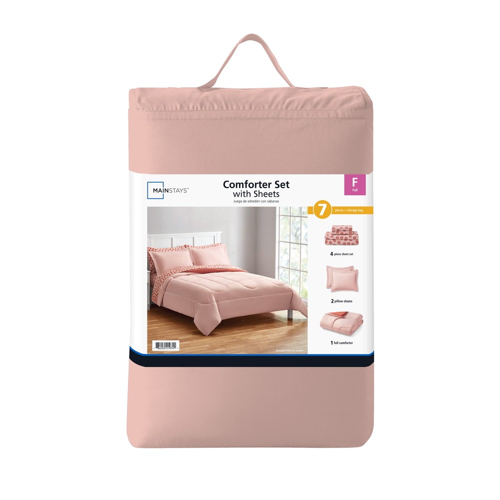 Brighten up your room with the soft pink reversible Bed-in-a-Bag Comforter Set which has everything you need to make your bed cozy and colorful from top to bottom. The adult, unisex reversible comforter allows you to change your look anytime you want, featuring a solid soft pink on one side, and a coordinating red canyon color on the other side. This complete set includes a comforter, matching pillow shams (twin set includes 1 sham) and a coordinating printed daisy sheet set. The bedding set comes with a cloth storage bag for effortless storage when not in use. Sewn-through channel quilting keeps the lofty comforter fill evenly distributed, ensuring the perfect fluff to keep you warm during any season. All pieces in this Bed-in-a-Bag Comforter set are made from an incredibly soft polyester, and are machine washable, making them easy to care for. Mainstays Pink Reversible Bed in a Bag Comforter Set with Sheets, Full,7pieces with Storage Bag Solid soft pink on one side and reversible to a coordinating red canyon color on the other side. Set includes a comforter, matching pillow shams (twin set includes 1 sham) and a coordinating sheet set Made from brushed microfiber polyester, lightweight yet durable, for a superior hand feel.