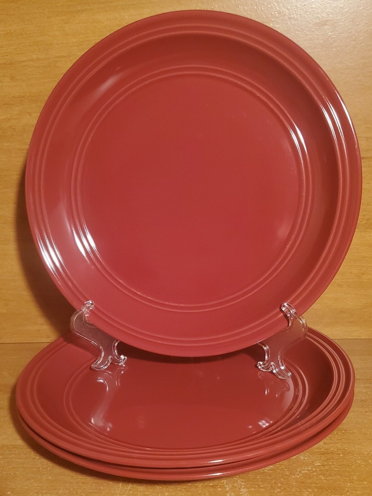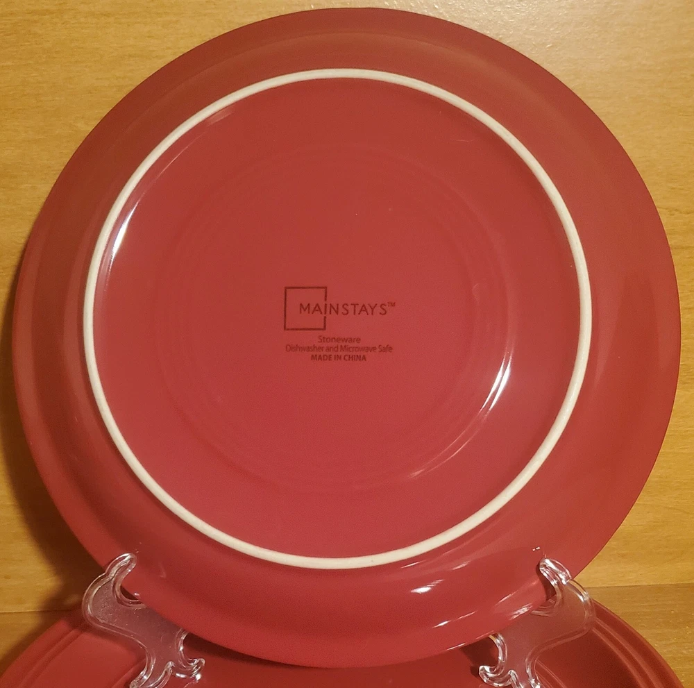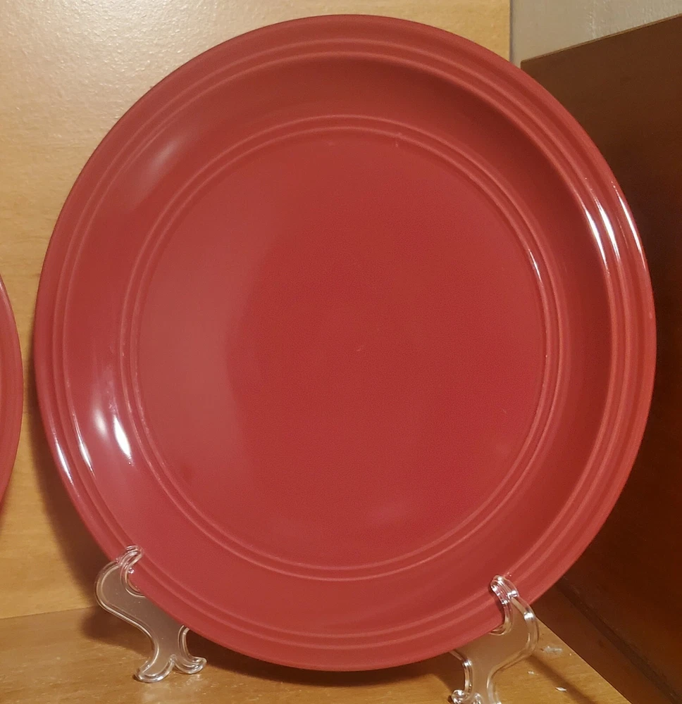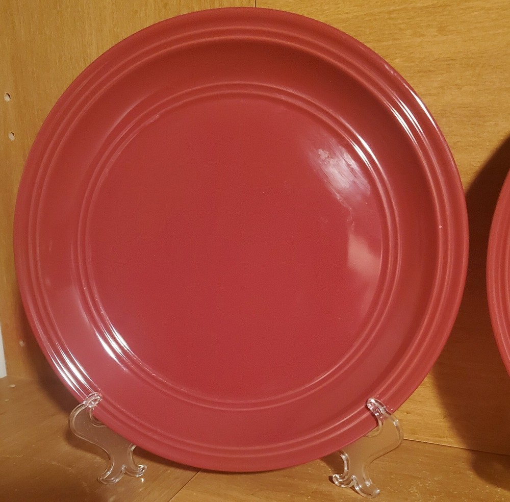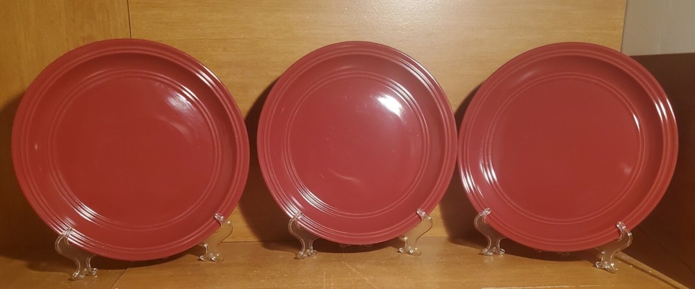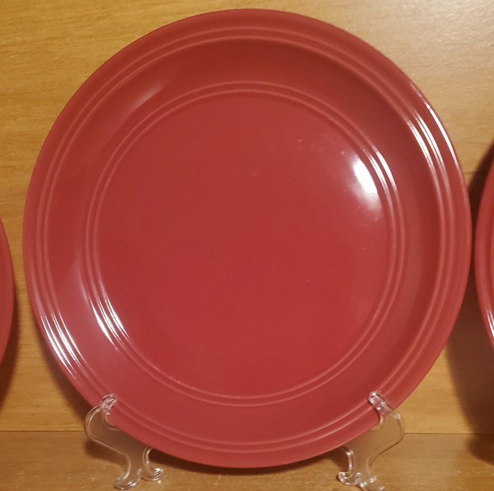 Red Sedona by Mainstays Status: Discontinued Actual: 2011 - 2016 Description: All Red Stoneware, Embossed Rings, Rim, No Trim Piece: Dinner plates Size: 10 5/8" Quantity: Set of 3 Visit My eBay Store for additional pieces in this pattern & other great items. I will combine shipping on orders of multiple items. I consider reasonable offers on all listings.