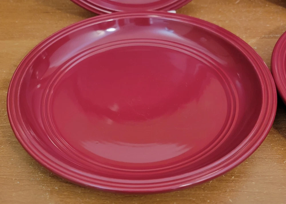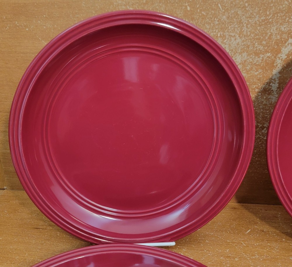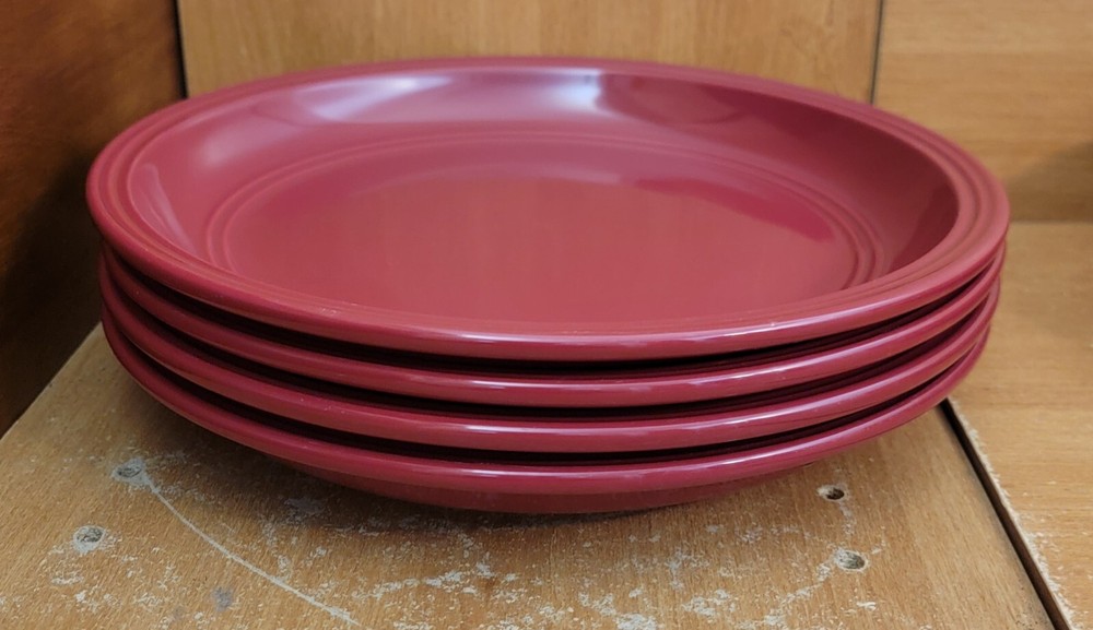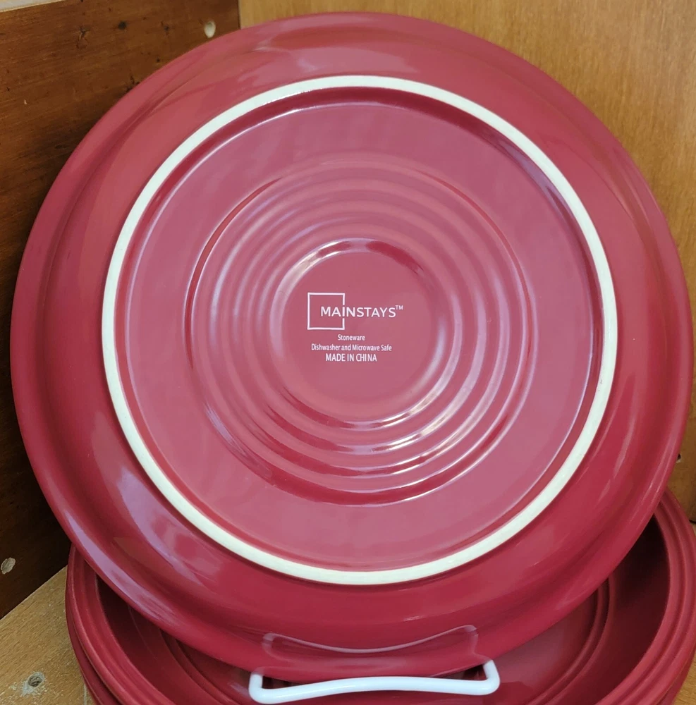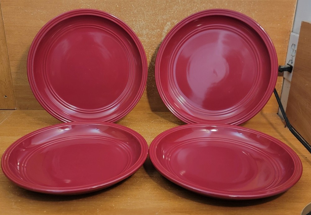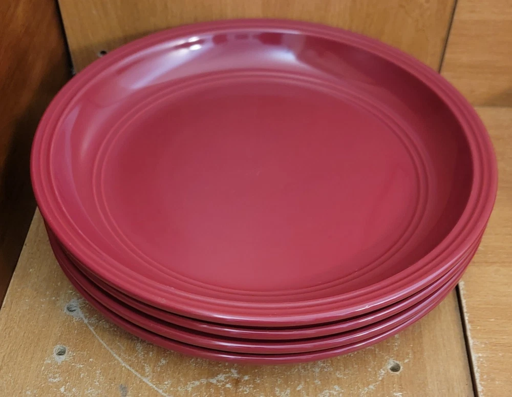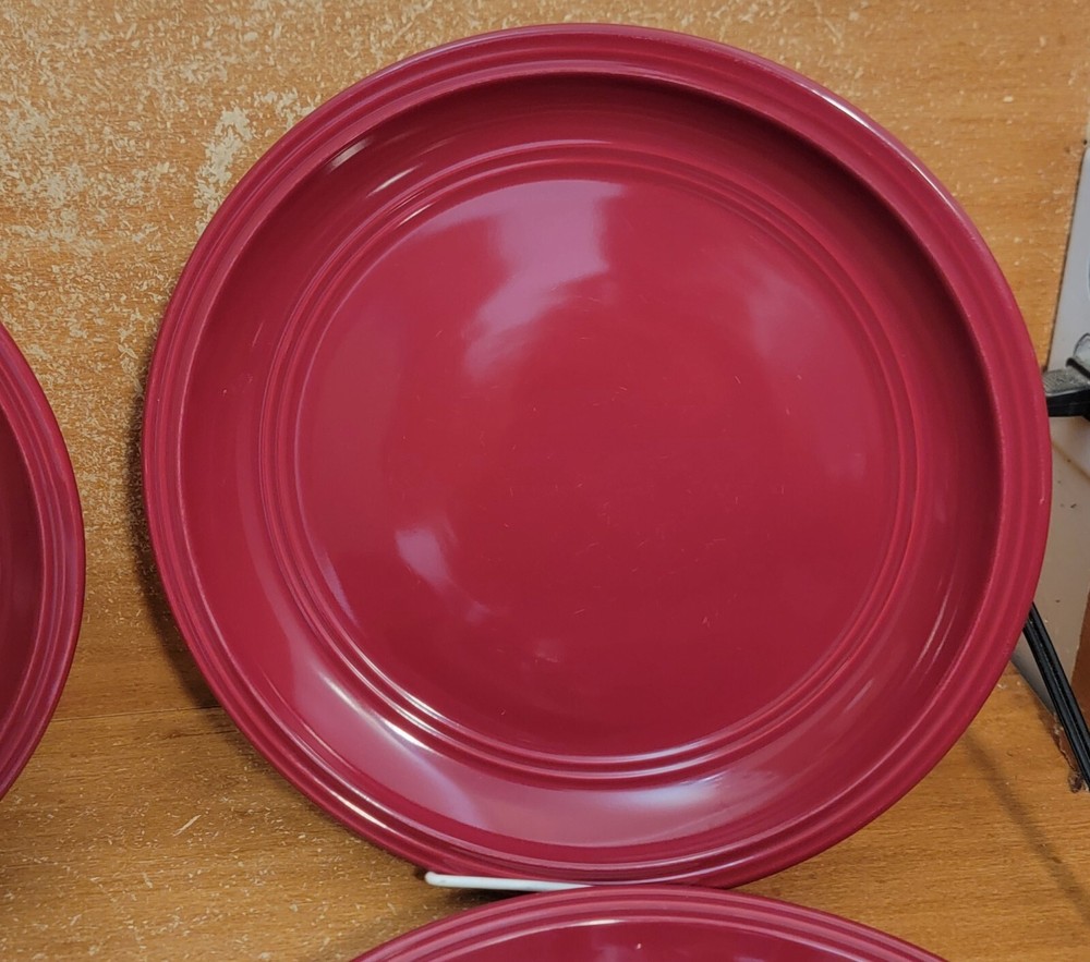 Red Sedona by Mainstays Status: Discontinued Actual: 2011 - 2016 Description: All Red Stoneware, Embossed Rings, Rim, No Trim Piece: Dinner plates Size: 10 5/8" Quantity: Set of 4 Visit My eBay Store for additional pieces in this pattern & other great items. I will combine shipping on orders of multiple items. I consider reasonable offers on all listings.