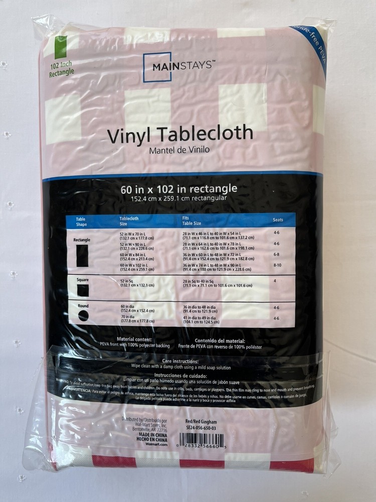 ~ Mainstays PEVA vinyl tablecloth is a cheery red and white checked gingham, rectangle in shape, and measures 60” wide by 102” long. It has a 100% polyester flannel backing, and is easy care, as you can wipe the top clean. Can be used for indoor as well as outdoor use. Completely reusable. ~ New in package, and comes from a non-smoking home. Thank you for looking!