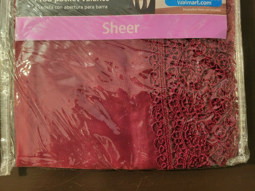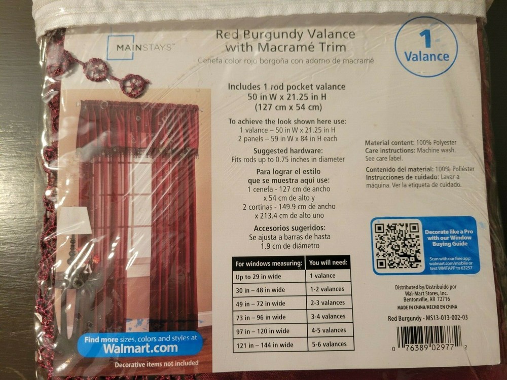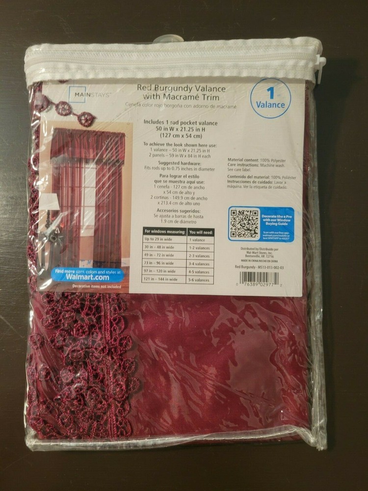 Mainstays Red Burgundy Valance w/ Macrame Trim 1 Sheer Rod Pocket Valance (NEW) For your conside ration is a Mainstays Red Burgundy Valance w/ Macrame Trim 1 Sheer Rod Pocket Valance (New) . This item is new. I have 5 available in the store while supplies last. I will combine shipping if you purchase more than one. Looks very nice on display. Lovely Curtain Valance by Mainstays. See terms and conditions. See shipping and payment instructions below. Review all photographs provided as they are a part of the description. Peg/Auc Inventory Location: Box #8 Winning bidders please remit payment via Paypal within 5 days of auction close. If payment is not received in 7 days of close of auction a case will be opened so the item can be re-listed. You will also be removed from purchasing future items in the store. If you have any shipping questions please ask before bidding. I will do my best to accommodate your needs based on the given situation. Canadian and International bidders, please contact me regarding shipping charges. I will combine shipping charges within 5 days of Auction close. Purchases will be packaged with the utmost care. If there is a problem due to shipping, I will give consideration of a partial refund within 14 days of mailing date and with regard to the circumstances. I will require proof of damage either by a photograph or return of the item at my discretion. Please keep packing material; box and item for proof of damages. You will be responsible for any shipping return charges. All our merchandise is sold as is with no returns. Only in rare circumstances at store management's discretion will we accept returns. Returns will be at buyer's expense within 14 days of mailing date and a partial or full refund will be given when received. We do our absolute best to describe any flaws or damage to any items that we list and take pictures to show as a part of our description, so review them carefully. If you are dissatisfied, please contact us and give us the opportunity to come to a mutual decision so you are satisfied prior to opening a case or leaving feedback. It is our pledge that you will receive the exact item you bid on, in the condition that we have stated. If there is a problem with your item upon receipt, please contact our store prior to leaving feedback as your satisfaction is important to us and we will do our very best to resolve the matter! In the event that I agree to refund your money or accept a return of the item, you will be responsible for all shipping charges unless we are clearly at fault. At times, items may be lost; stolen or missing from our stock. Under these circumstances, we do our very best to immediately inform the customer, cancel the order and issue a refund. These type situations are out of our control, so when they occur, we ask for your understanding. If the item is located, we will notify the customer and in most cases, the item is re-purchased and everyone is happy. Thank you for your patronage and understanding. We do not take misconduct of any manner by our customers lightly. Ebay will be notified and you will be removed from purchasing from our store. You will be removed from purchasing items in our store if we so desire based on wrongful circumstances and inappropriate behavior on the buyers part. Each item is marked for identification - meaning we are completely aware if an item has been switched; changed or wrongly damaged or replaced. We have a record of each item by proof of item marking; photograph; video and/or certification of each item as it is represented in the description immediately prior to leaving our location. We will notify Ebay immediately if we believe fraud has occurred. Anyone misrepresenting Ebay's policy and procedures will be reported accordingly. The store has a variety of items that appeal to the customer. Items are listed to the best of our ability and we appreciate any feedback you may have to improve upon our services. If the listing does not have information in the description of an item that you may be aware of, we appreciate you telling us so we can better serve you! We have many comeback customers and appreciate your trust and patronage. Please contact us through e-bay mail. All communication must go through e-bay. We will get back to your questions as quickly as possible. We do not respond to mean spirited messages or any misrepresentation of Ebay policy. We will notify Ebay if so warranted.