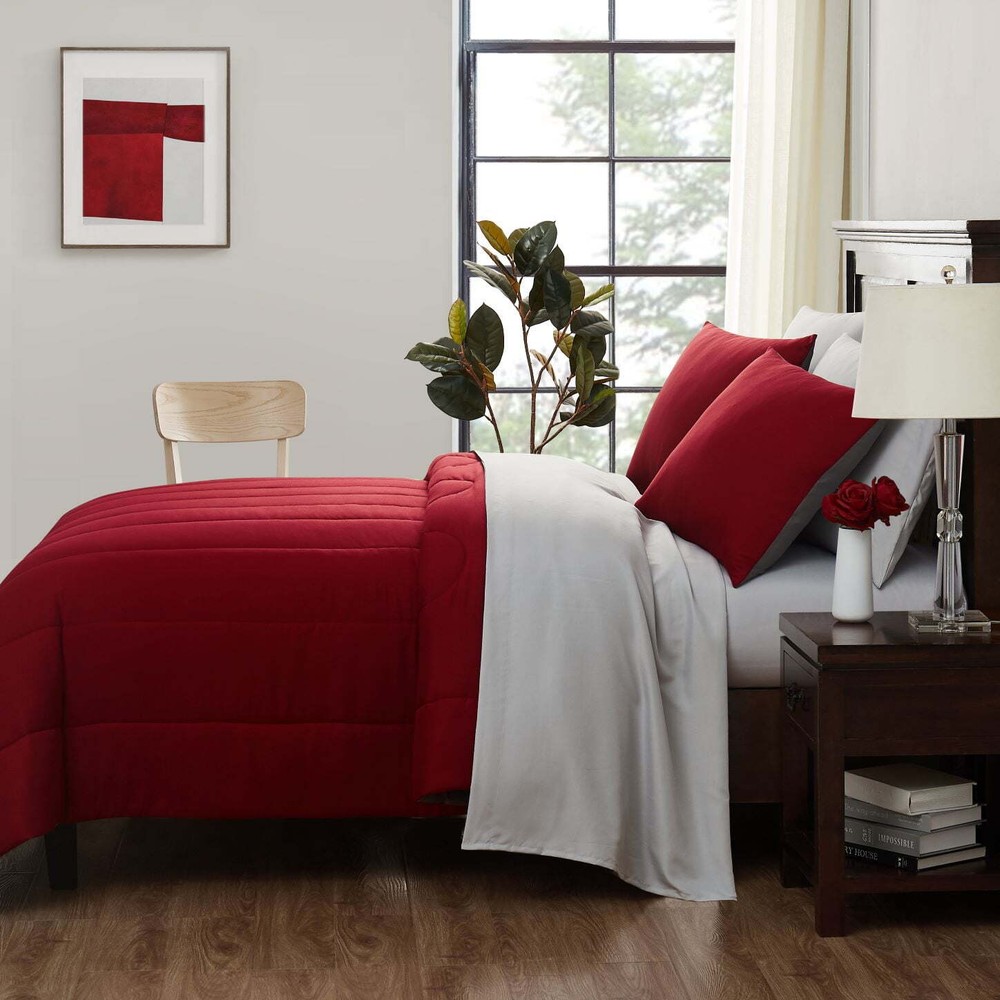 Love this reversible comforter set! The bold red color looks great, and flipping it gives a fresh look. Sheets are soft, everything fits my full bed perfectly—super convenient and great for the price. Washes well without fading. Highly recommend for an easy, stylish bedroom update!