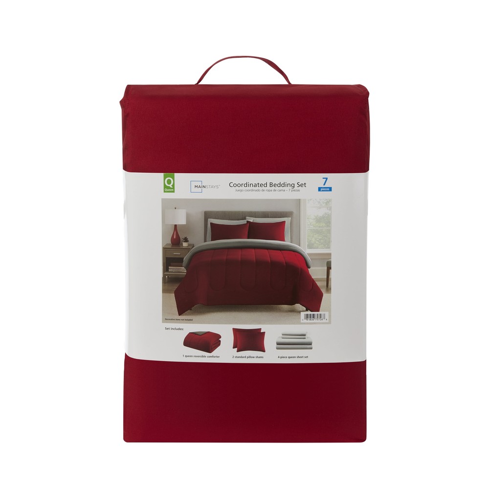 The Mainstays Red 7-Piece Bed in a Bag comes with everything you need to complete your bedroom space. The solid print Red comforter brings a bold complement to your bedroom's aesthetic, and the light grey sheets add the perfect of contrast. The soft-to-the-touch fabric adds to your overall comfort, helping you sleep soundly through the night. King size includes: Comforter (102" x 90"), Flat Sheet (108" x 102"), Fitted Sheet (78" x 80" x 12"), 2 Shams (20" x 36"), 2 Pillowcases (20" x 40"). Available in Twin, Full, Queen, and King sizes. This 100% polyester bedding set is machine washable for easy care. Available in Twin/Twin-XL, Full, Queen and King sizes King size includes: Comforter (102" x 90"), Flat Sheet (108" x 102"), Fitted Sheet (78" x 80" x 12"), 2 Shams (20" x 36"), 2 Pillowcases (20" x 40") Reversible Comforter Machine Washable 100% Polyester
