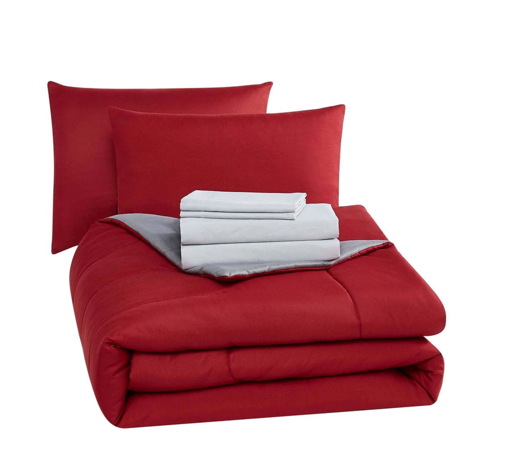 The Mainstays Red 7-Piece Bed in a Bag comes with everything you need to complete your bedroom space. The solid print Red comforter brings a bold complement to your bedroom's aesthetic, and the light grey sheets add the perfect pop of contrast. The soft-to-the-touch fabric adds to your overall comfort, helping you sleep soundly through the night. Queen size includes: Comforter (76" x 90"), Flat Sheet (81" x 96"), Fitted Sheet (54" x 75" x 12"), 2 Shams (20" x 26"), 2 Pillowcases (20" x 30"). Available in Twin, Full, Queen, and King sizes. This 100% polyester bedding set is machine washable for easy care. Available in Twin/Twin-XL, Full, Queen and King sizes Queen size includes: Comforter (76" x 90"), Flat Sheet (81" x 96"), Fitted Sheet (54" x 75" x 12"), 2 Shams (20" x 26"), 2 Pillowcases (20" x 30") Reversible Comforter Machine Washable 100% Polyester