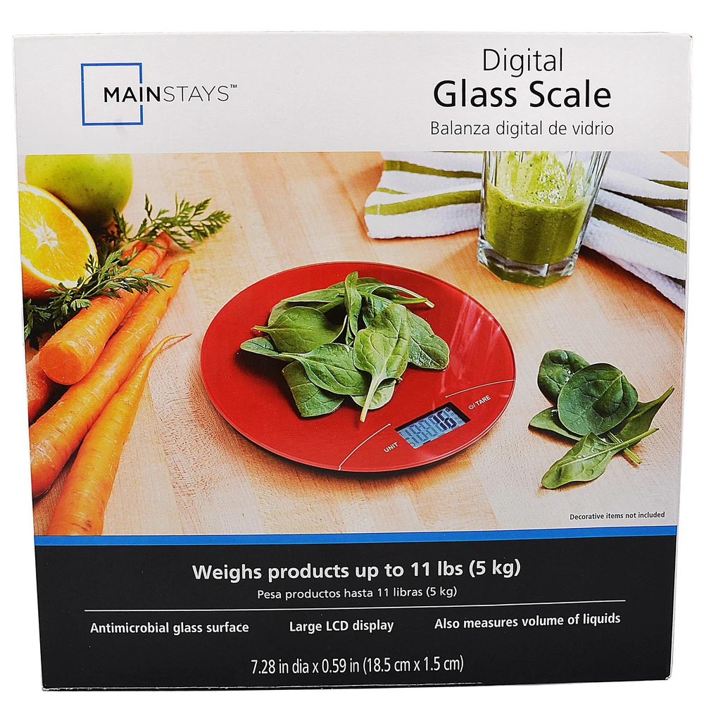 Mainstays Red Round Digital Glass Scale Weighs Up to 11 Lbs with LCD Display Mainstays offers a great way to measure your food intake, weigh ingredients and the volume of liquids with a Round Digital Scale that weighs products up to 11 lbs. Accurate down to the gram, the scale shows item weight on a large LCD display. It is safe for food use thanks to the antimicrobial glass surface. It measures 7.28 inches in diameter and is .59 inches thick. 11 Pound max scale Food safe Antimicrobial surface Large LCD display Accurate to one gram Color: Red Shape: Round Brand New in Package FREE FAST SHIPPING!!!