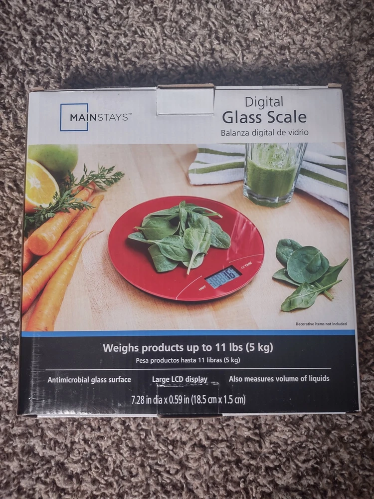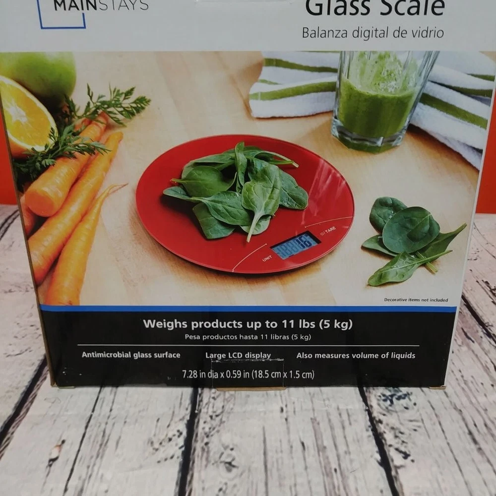 🪴 Mainstays Digital Glass Scale 🪴 Elevate your kitchen experience with this stylish and functional Mainstays digital glass scale ! 🍽️ 🔴 Design: Sleek red color and round shape that adds a pop of style to your countertop. ⚖️ Capacity: Weighs up to 11 lbs for all your cooking and baking needs. 📊 Display: Features a clear digital LCD display for easy reading. 📏 Measurements: Offers both weight and volume measurements for convenience. ⚙️ Functions: Includes zero and tare functions for precise measuring. 🔋 Safety: Equipped with a low battery indicator and automatic shutoff for energy efficiency. 🧽 Maintenance: Lightweight and easy to clean for your convenience. Perfect for anyone who wants accurate measurements without the hassle of bulky, analog scales. Order yours today! 🛒