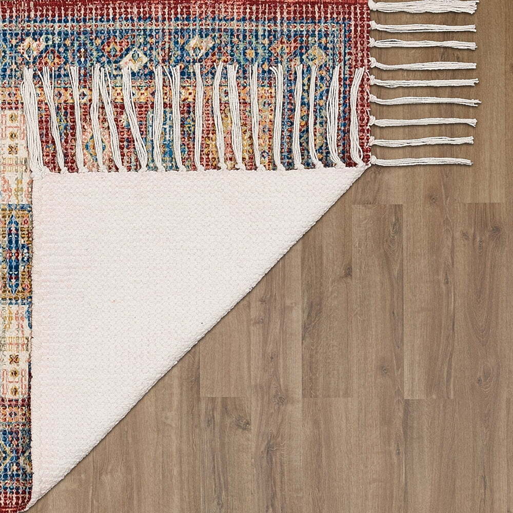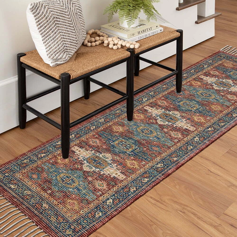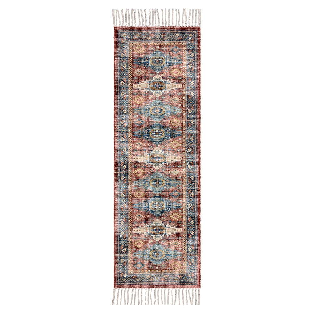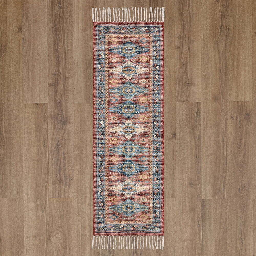 The eclectic style of the Mainstays Celia Red Vintage Indoor Runner Rug, size 20” x 60”, is influenced by artisan crafted antique tapestries. Globally inspired, this rug is cast in a bold palette of red, blue, cream and gold. Woven with a blend of natural cotton and premium stain-resistant synthetic yarn, this rug is suitable for high traffic areas and ideal for hallways, entryways, kitchens and more. Finished with a non-skid backing, this rug is designed to stay securely in place. Simply spot clean any messes with warm water and mild detergent. Size: 20"x60" Woven Made with a blend of natural cotton and premium stain-resistant synthetic yarn Suitable for high traffic areas Ideal for hallways, entryways, and kitchens Non-skid backing Spot clean messes with warm water and mild detergent